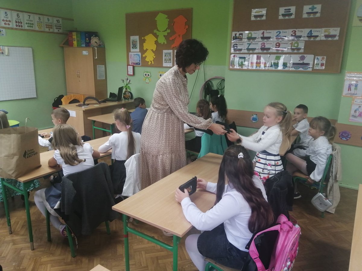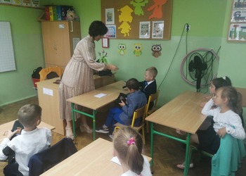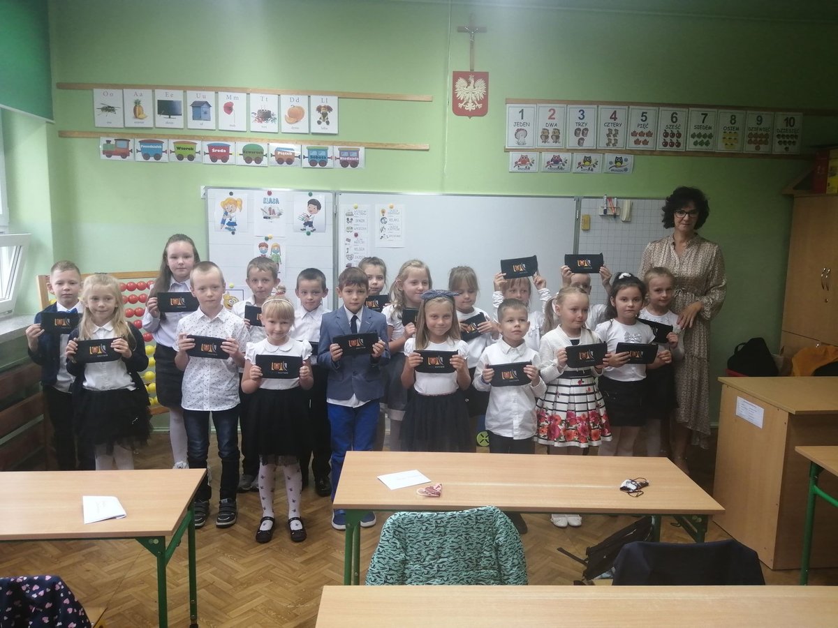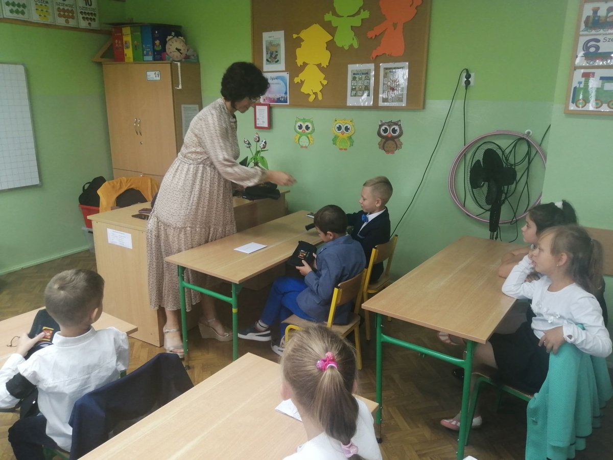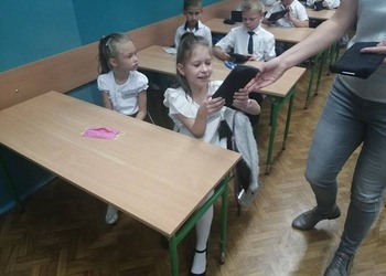 Tak niedawno staliśmy w przedszkolu, aby życzyć sobie udanego wypoczynku. Dziś opaleni, z uśmiechami na twarzach, ale przede wszystkim wypoczęci po raz pierwszy przekroczyliśmy próg szkoły jako uczniowie klas pierwszych. W salach lekcyjnych czekała na nas miła niespodzianka; Panie wręczyły nam piórniki z logo naszej gminy, przekazane przez Burmistrza MiG Krzywiń Jacka Nowaka.