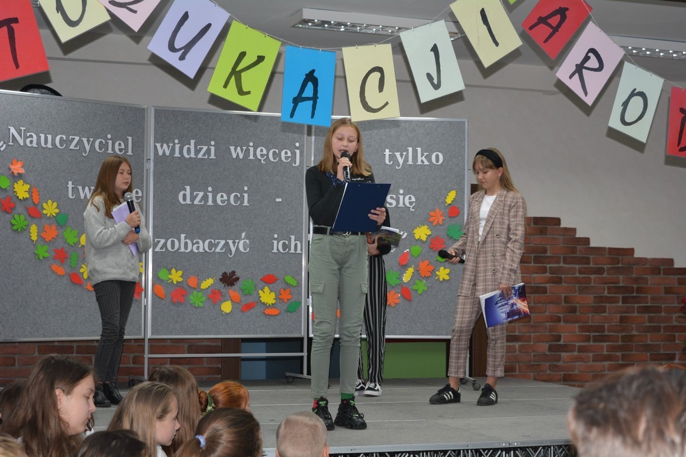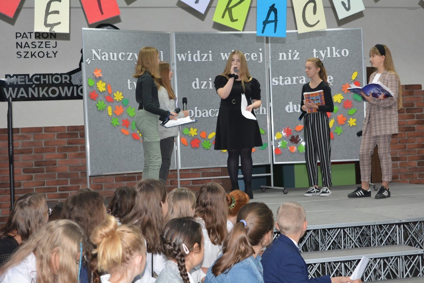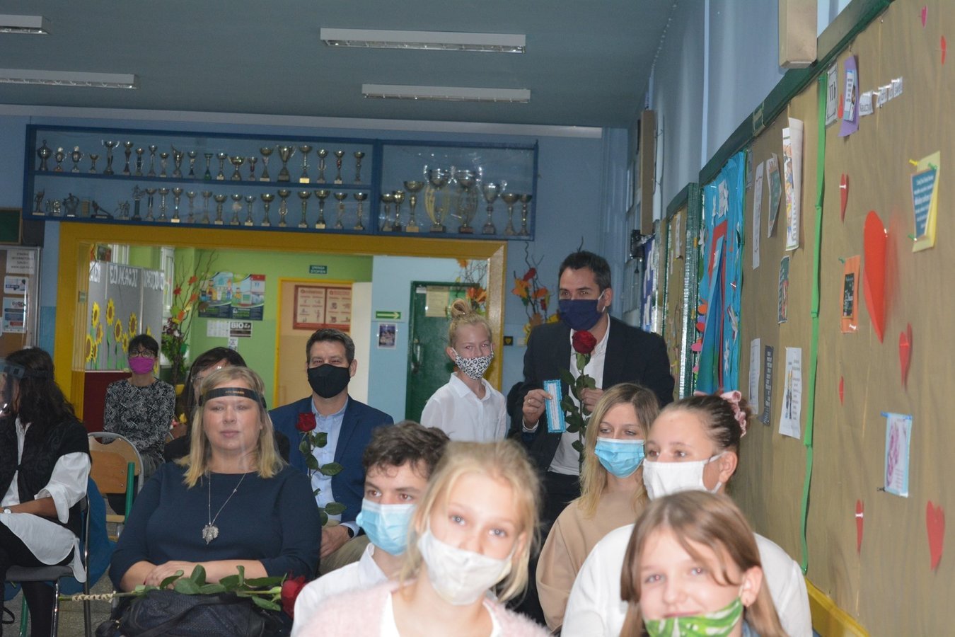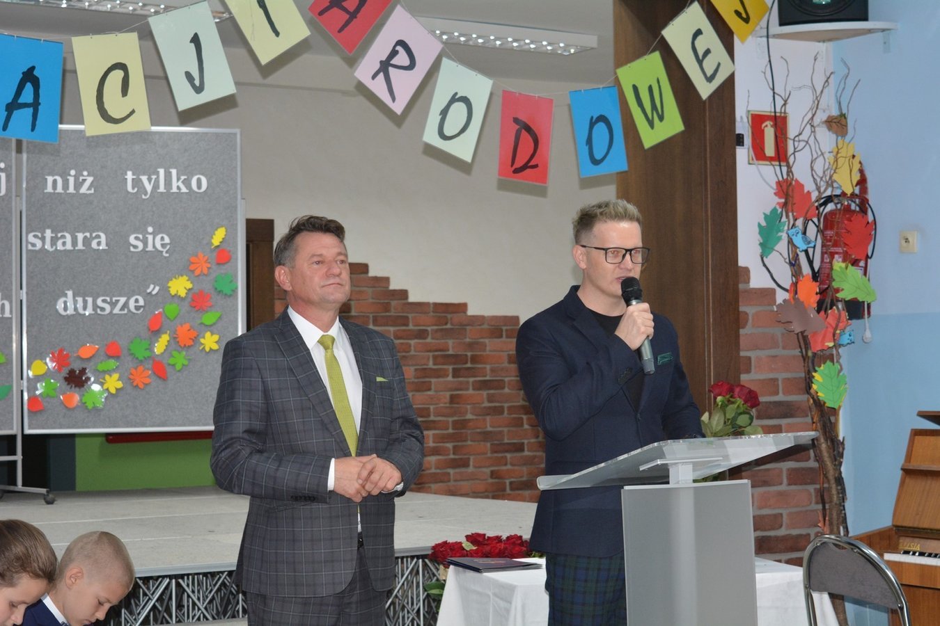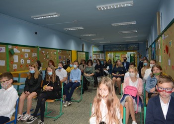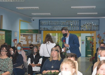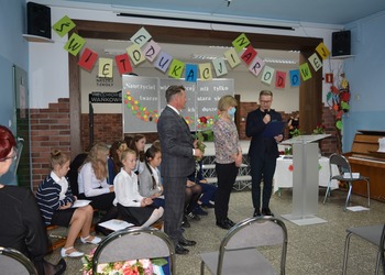 Na dolnym korytarzu, oprócz uczniów, zasiedli pracownicy szkoły oraz zaproszeni goście. Zebranych powitali uczniowie. Następnie głos zabrali wicedyrektorzy: Rafał Szłapka oraz Jarosław Drożdżyński. Życzenia złożyli burmistrz Miasta i Gminy Krzywiń Jacek Nowak oraz przewodniczący Rady Rodziców Jakub Majorek. Wówczas na scenie ponownie pojawili się uczniowie, by żartem i piosenką wprowadzić wszystkich dobry nastrój. Swój występ zakończyli słowami: