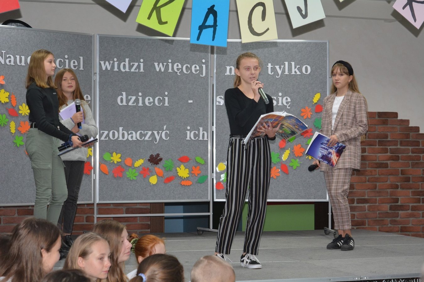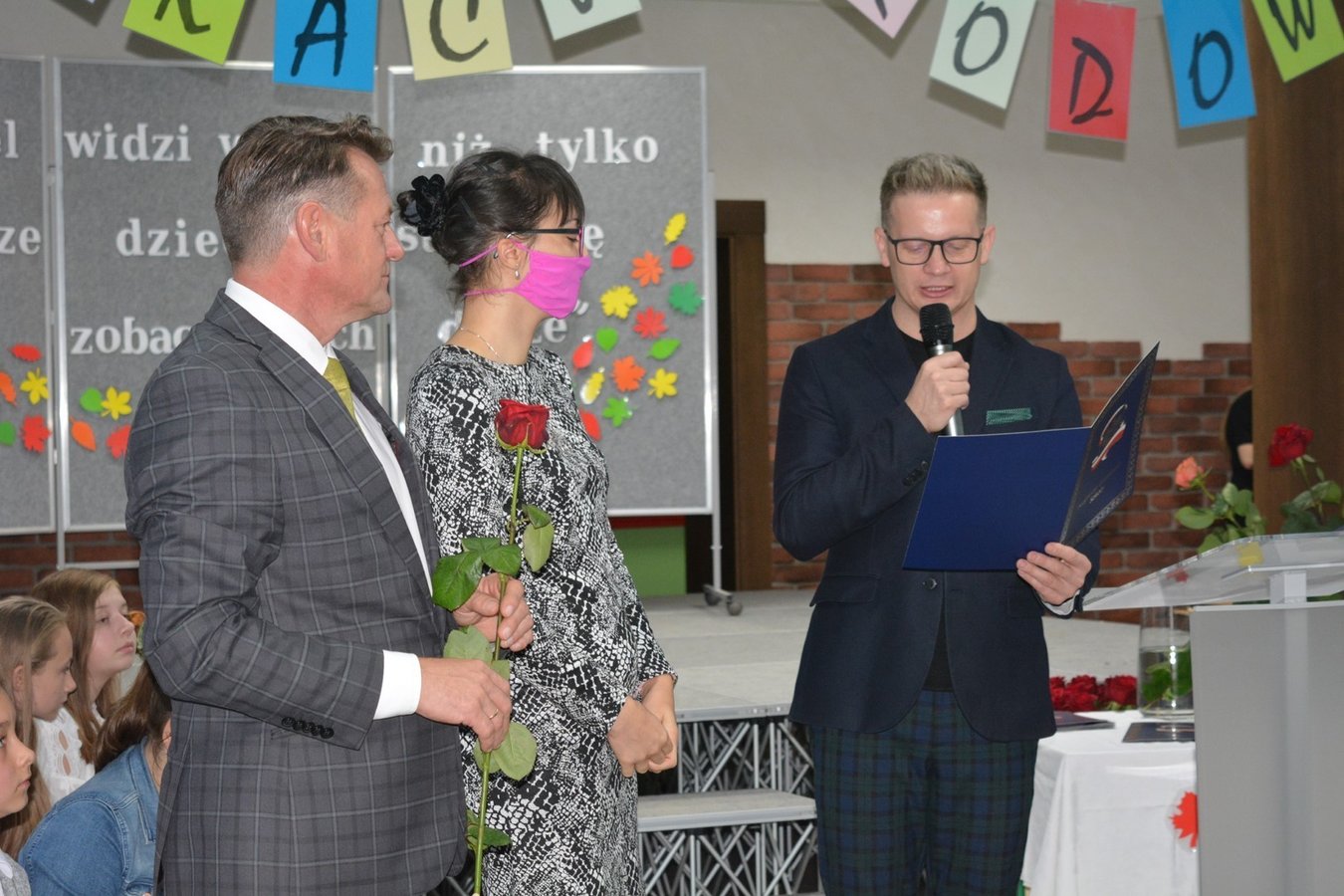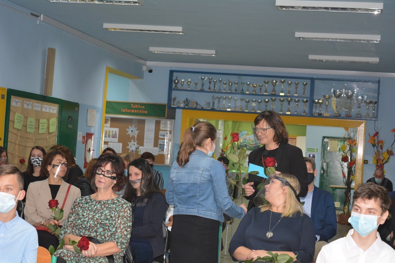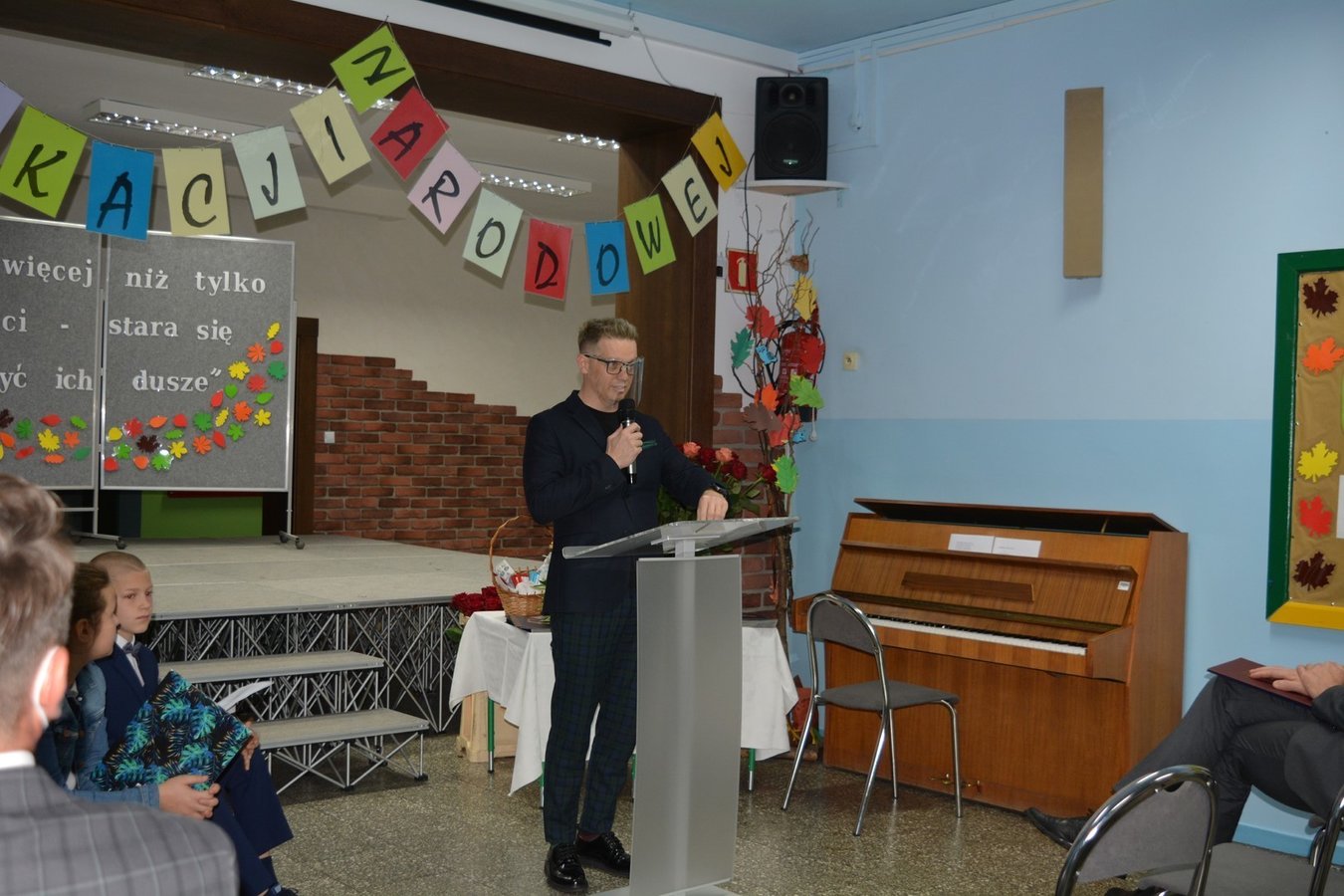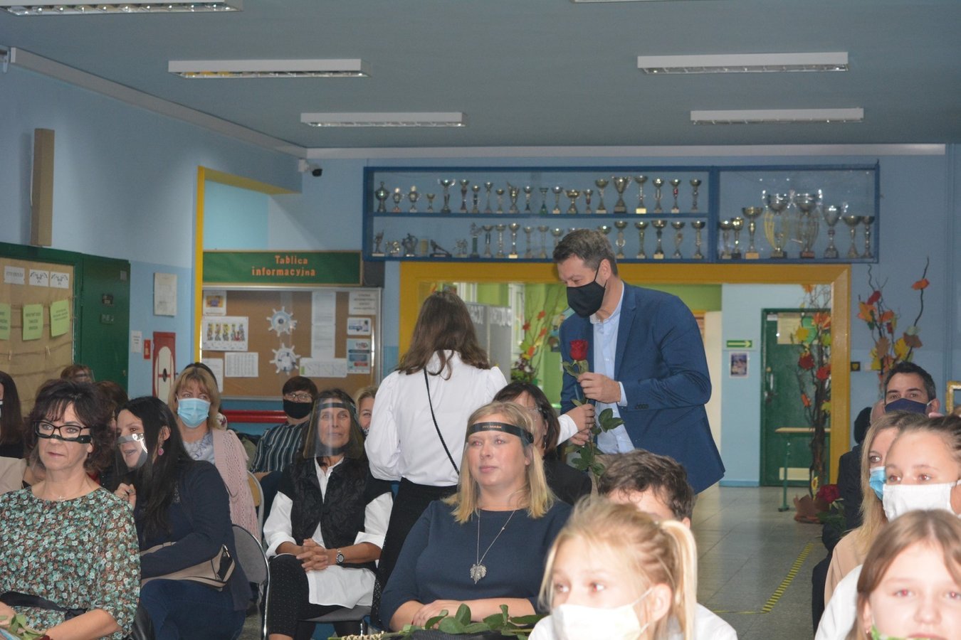Na dolnym korytarzu, oprócz uczniów, zasiedli pracownicy szkoły oraz zaproszeni goście. Zebranych powitali uczniowie. Następnie głos zabrali wicedyrektorzy: Rafał Szłapka oraz Jarosław Drożdżyński. Życzenia złożyli burmistrz Miasta i Gminy Krzywiń Jacek Nowak oraz przewodniczący Rady Rodziców Jakub Majorek. Wówczas na scenie ponownie pojawili się uczniowie, by żartem i piosenką wprowadzić wszystkich dobry nastrój. Swój występ zakończyli słowami: