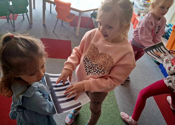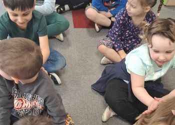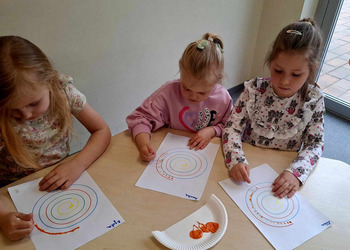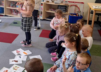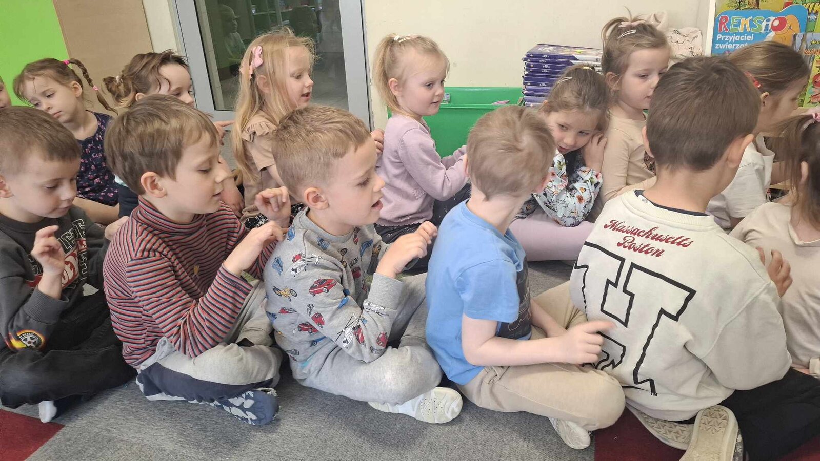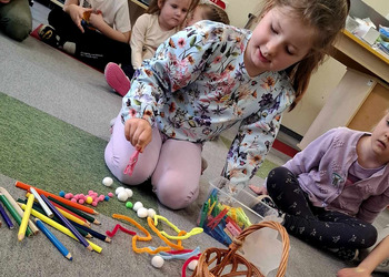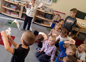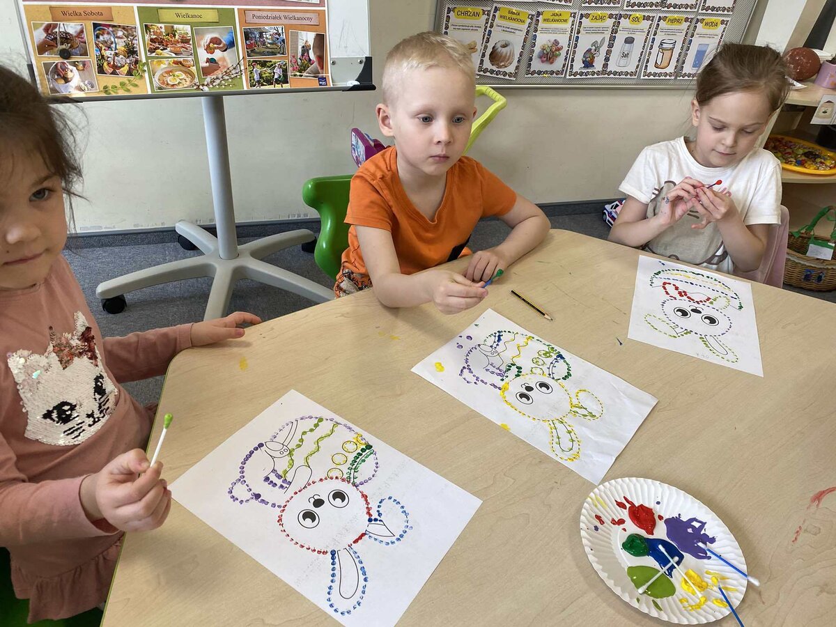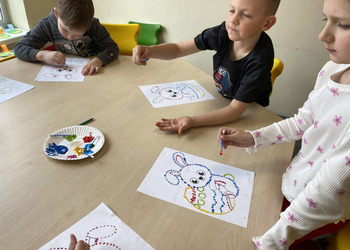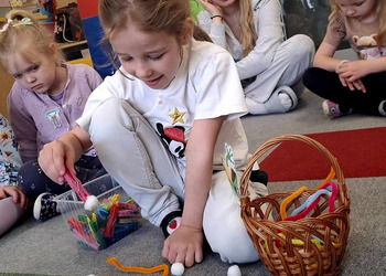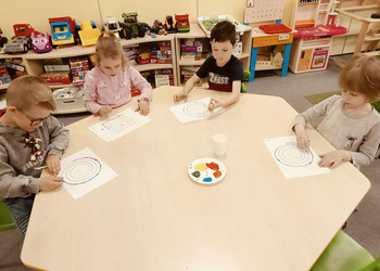 W kwietniu przedszkolaki z grup: Żabki, Krasnale, Motylki i Pszczólki zrealizowały ostatnie bloki tematyczne Innowacji „ Grafomotoryka w zabawach ukryta” a w nich: