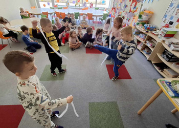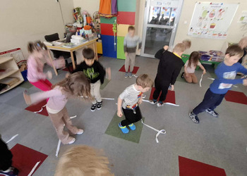 - „Esy –floresy i sznurek w roli głównej” ćwiczenia i zabawy doskonalące koordynację ciała i ruchy naprzemienne .