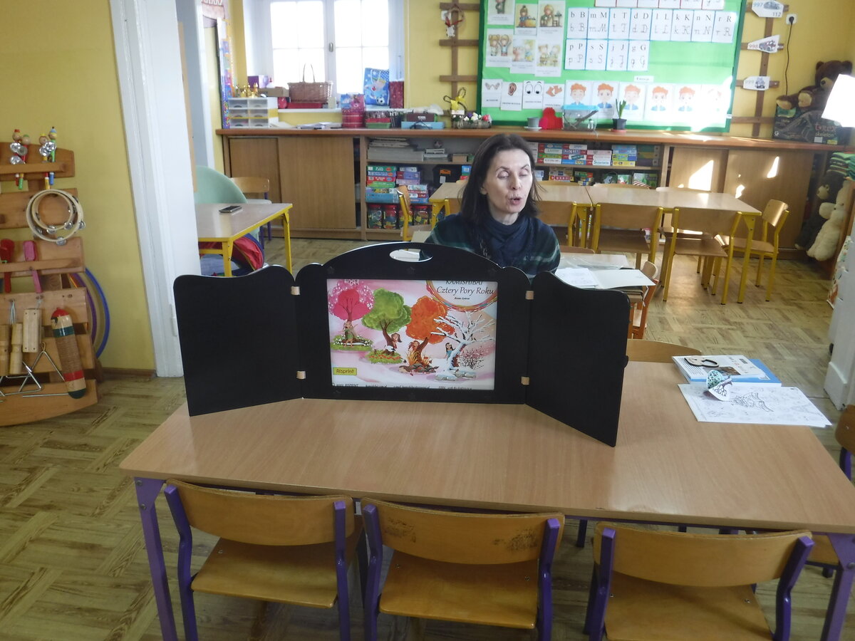 We wtorek w naszym przedszkolu odbyło się wyjątkowe spotkanie z bibliotekarką panią Lidią Szczerbal. Celem spotkania było rozwijanie zainteresowania książkami. Pani Lidka przedstawiła naszym przedszkolakom bajkę pt. „Cztery pory roku” wykorzystując kamishibai czyli japońską sztukę opowiadania i czytania. Kamishibai to wyjątkowa forma teatru, gdzie za pomocą obrazków wsuwanych do drewnianej skrzynki snuje się opowieść tak, jak ją czytający czuje. Bajka ta wzbudziła w dzieciach wiele emocji i zachęciła do rozmów o porach roku oraz ich charakterystycznych cechach.