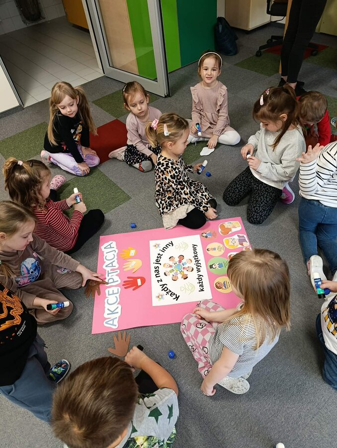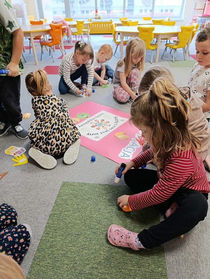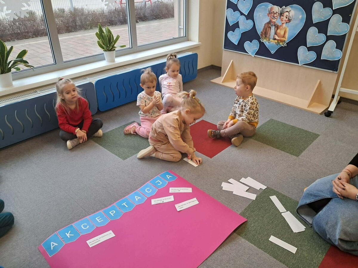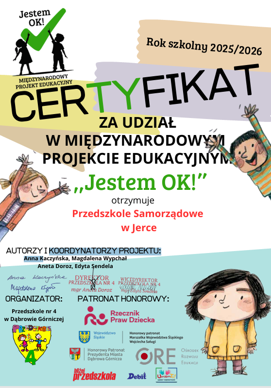 Przedszkolaki z Jerki w okresie od 1 listopada 2025 r. do 31 stycznia 2026 r. brały udział w Międzynarodowym Projekcie Edukacyjnym „Jestem OK!”. Celem przedsięwzięcia było rozwijanie kompetencji społecznych i emocjonalnych najmłodszych. Podczas realizacji projektu dzieci uczyły się wzajemnego szacunku, empatii i życzliwości, wzmacniały poczucie własnej wartości oraz budowały atmosferę bezpieczeństwa i współpracy w grupie. Poznawały również sposoby radzenia sobie w trudnych sytuacjach, ćwiczyły asertywność oraz uczyły się, jak wyrażać swoje emocje, potrzeby w sposób akceptowalny dla innych. Ważnym elementem zajęć były wspólne rozmowy i aktywności inspirowane książkami „Jesteśmy dla siebie dobrzy”, poruszającą temat życzliwości, empatii i relacji rówieśniczych oraz „Nie mów tak do mnie”, dotyczącą komunikacji, wyznaczania granic i asertywności. Zwieńczeniem całej projektowej przygody były obchody Międzynarodowego Dnia Akceptacji, przypadającego 20 stycznia. Była to doskonała okazja do podsumowania zdobytej wiedzy i przypomnienia, jak ważne są wzajemny szacunek, akceptacja i dobre relacje z innymi.