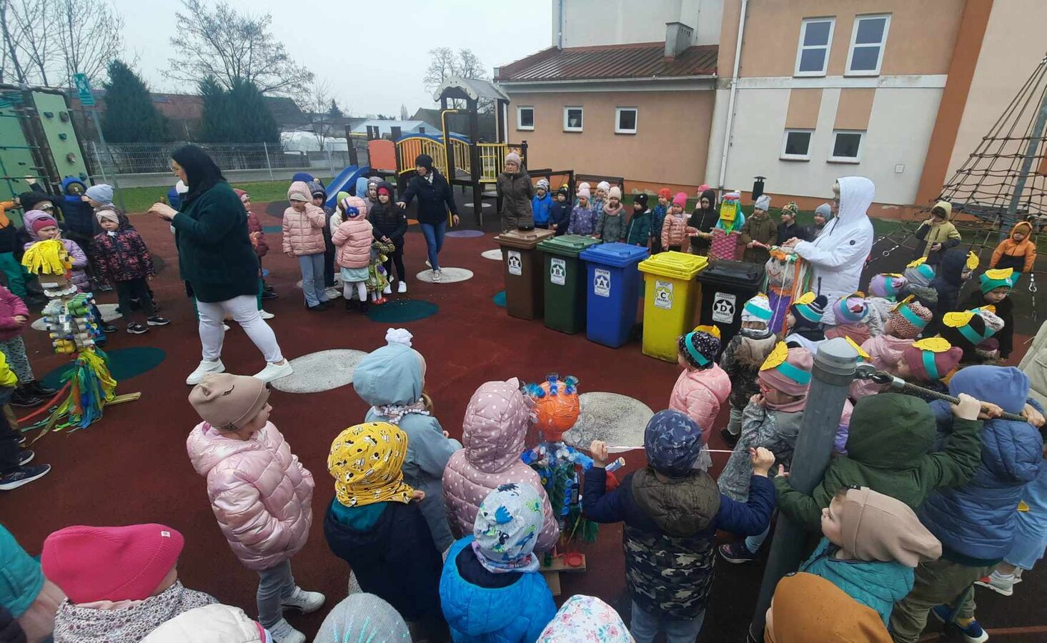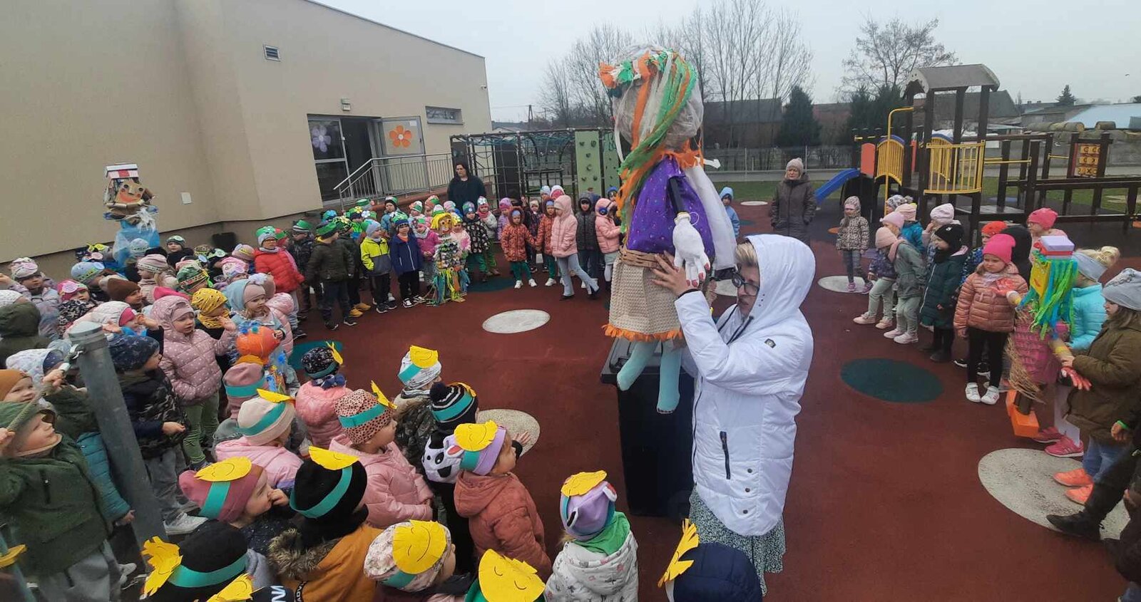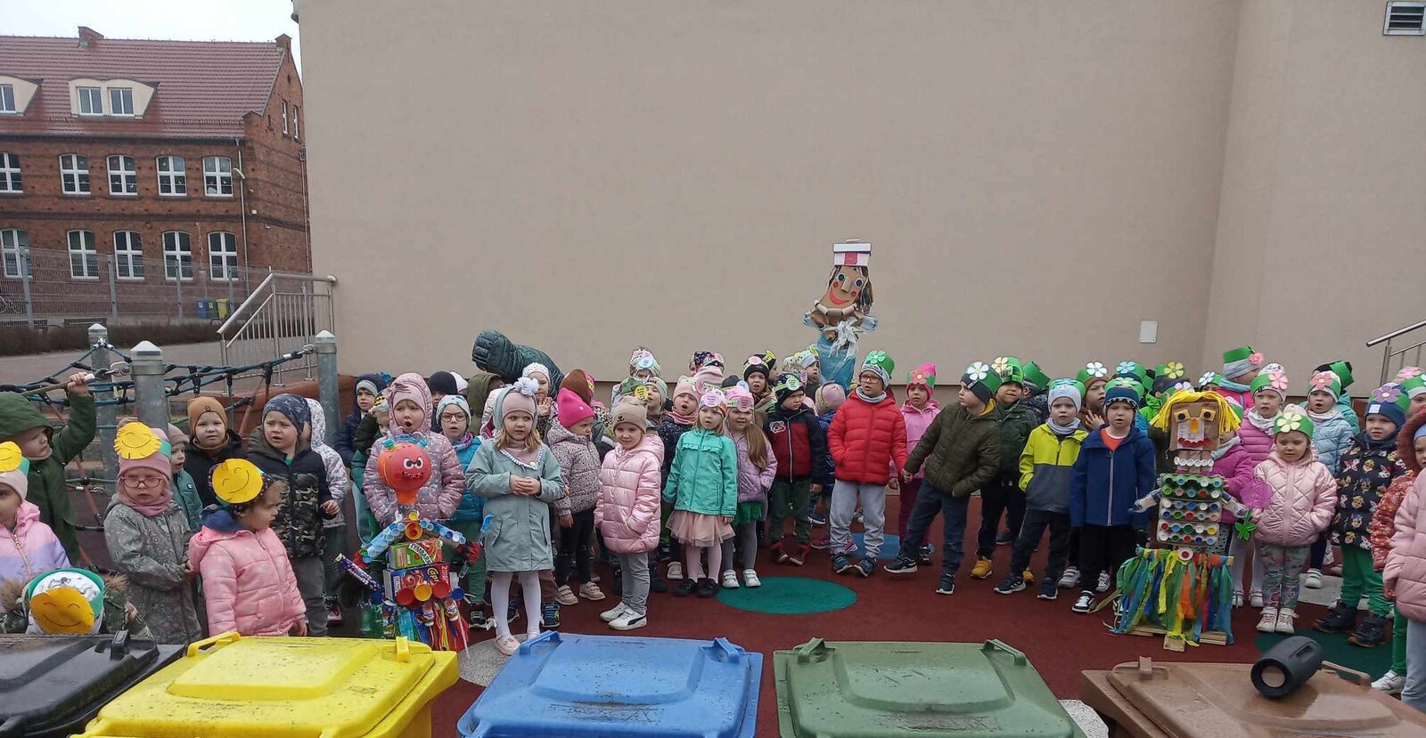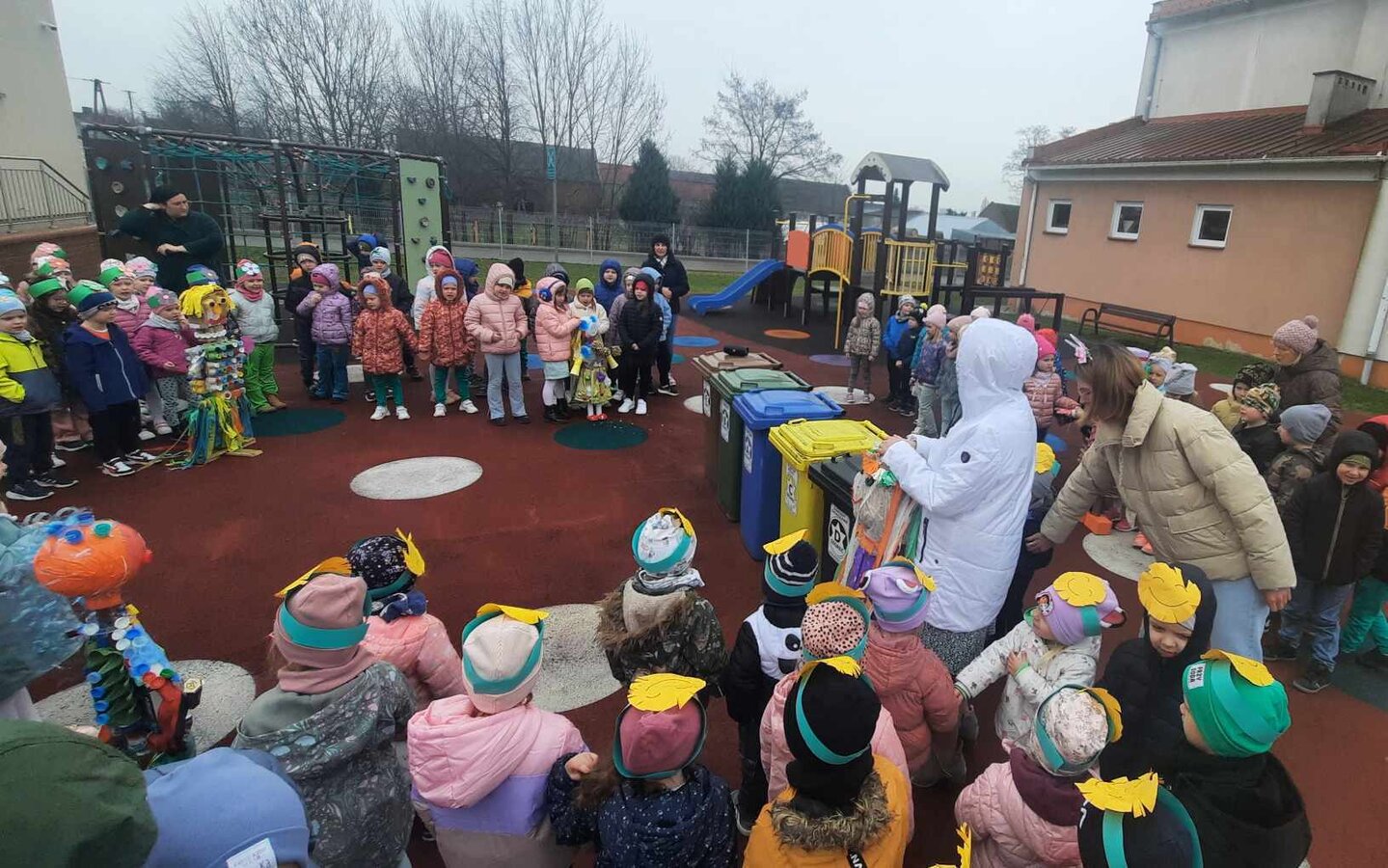 W czwartek 21 marca 2024r. wszystkie dzieci z naszego przedszkola świętowały nadejście Wiosny. Dla każdego przedszkolaka jest to bardzo wyczekiwane wydarzenie. Tego dnia wszyscy przyszli ubrani w odcieniach barw zieleni. Dzień rozpoczęliśmy od rozmów o nowej porze roku oraz od wesołych zabaw przy muzyce. Następnie Przedszkolaki przywitały Wiosnę przedszkolnym konkursem ekologicznym pt. ‘’Wiosna ubiera się Eko! Logicznie!” . Przedszkolaki, które wzięły w nim udział miały okazję zaprezentować przygotowane z pomocą Rodziców przepiękne stroje wykonane z materiałów przeznaczonych do recyklingu. Wszystkich nas zaskoczyła niezwykła kreatywność uczestników, wykorzystane do wykonania strojów ciekawe materiały, a także staranność oraz estetyka prac. Wielobarwne kreacje idealnie obrazowały Wiosnę, która do nas zawitała. Punktualnie o godzinie 12:00 , uśmiechnięci wyruszyliśmy na plac zabaw naszego przedszkola, gdzie pożegnaliśmy zimę wraz z Eko-Marzanną. Dodatkowo dzieci próbowały odstraszyć zimę, śpiewając głośno piosenki o wiośnie. Następnie nasze grupowe Eko-Marzanny znalazły się w odpowiednich pojemnikach do segregacji odpadów. Cieszymy się, że w taki sposób mogliśmy w pełni przywitać wiosnę, która obdarowała nas pięknym słoneczkiem. Mamy nadzieję, że dzięki zaangażowaniu naszych przedszkolaków wiosna zawita do nas na dobre, a wraz z nią ciepłe dni, z których będziemy czerpać radość.