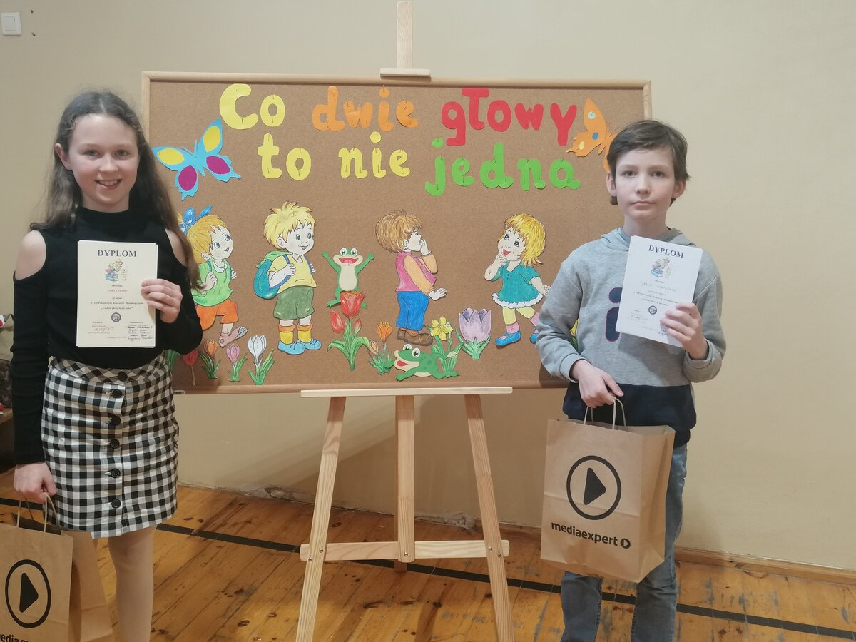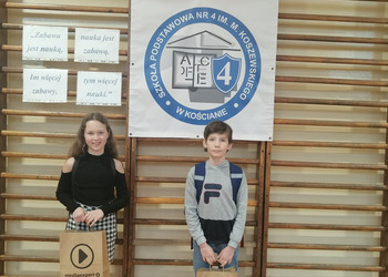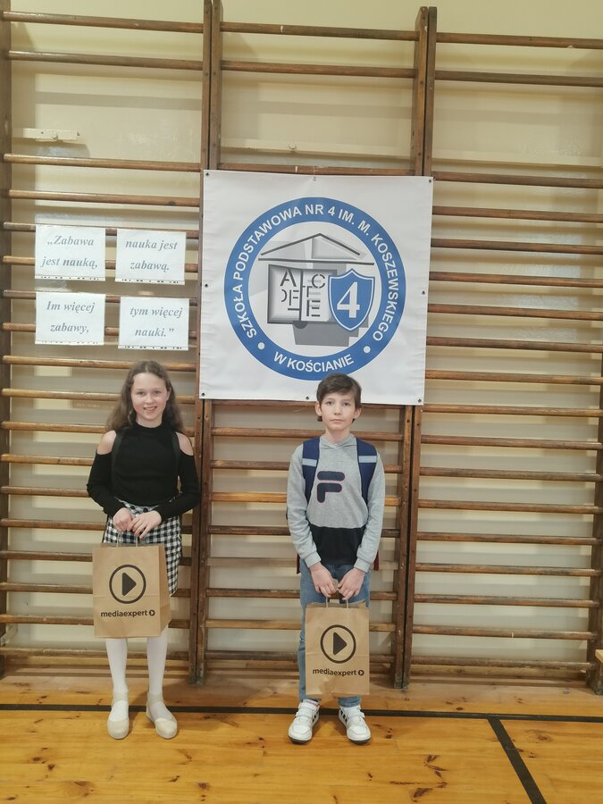 Dnia 19 kwietnia 2023 roku w Szkole Podstawowej nr 4 w Kościanie odbył się Powiatowy Konkurs Matematyczny dla klas czwartych „Co dwie głowy, to nie jedna”. Naszą szkołę reprezentowali Aniela Praiss i Jakub Bartkowiak z kl. 4a. Rywalizowali oni z uczniami z 15 szkół powiatu kościańskiego. Konkurs składał się z dwóch części: testu oraz łamigłówek matematycznych. Anielka i Jakub godnie zaprezentowali naszą szkołę zajmując 1 miejsce. Serdecznie gratulujemy sukcesu.
