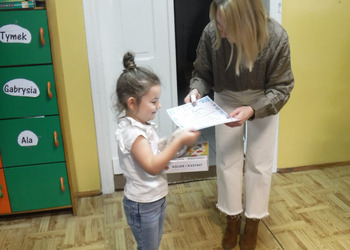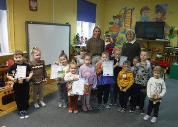 Z tej okazji zaprosiliśmy do przedszkola Dyrektora Zespołu Szkół w Jerce panią Izabelę Kostrzewę, która wszystkim dzieciom wręczyła nagrody, dyplomy oraz pogratulowała dzieciom sukcesu.