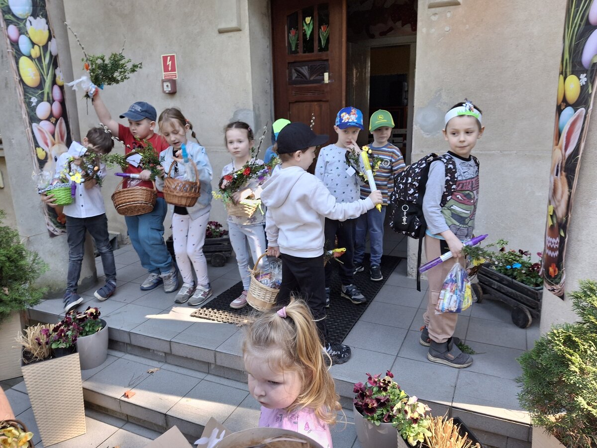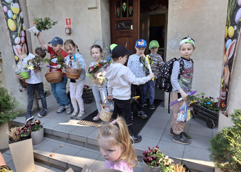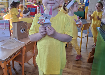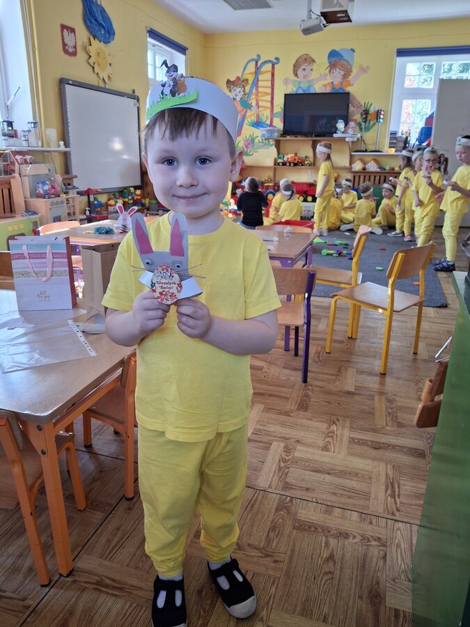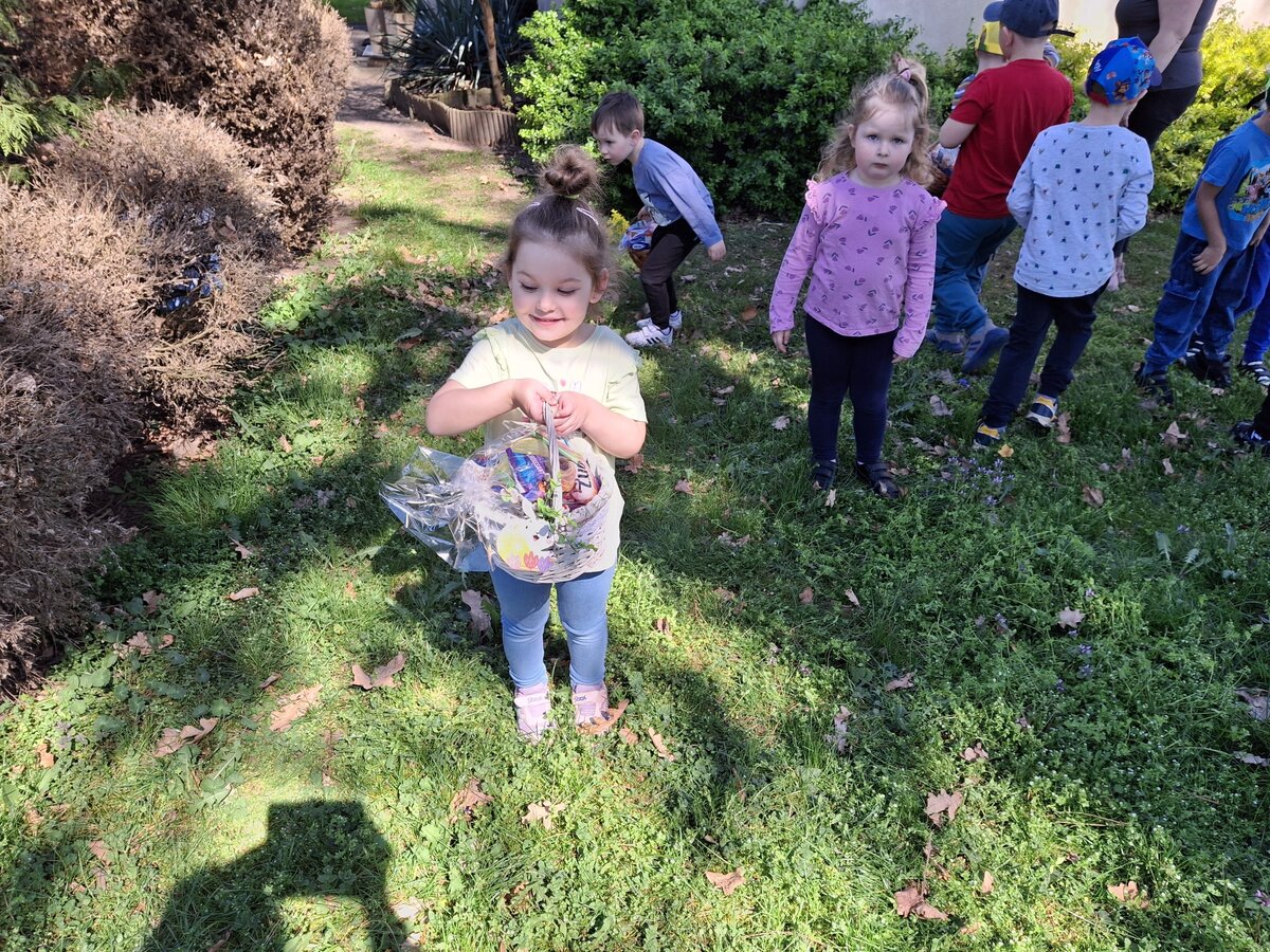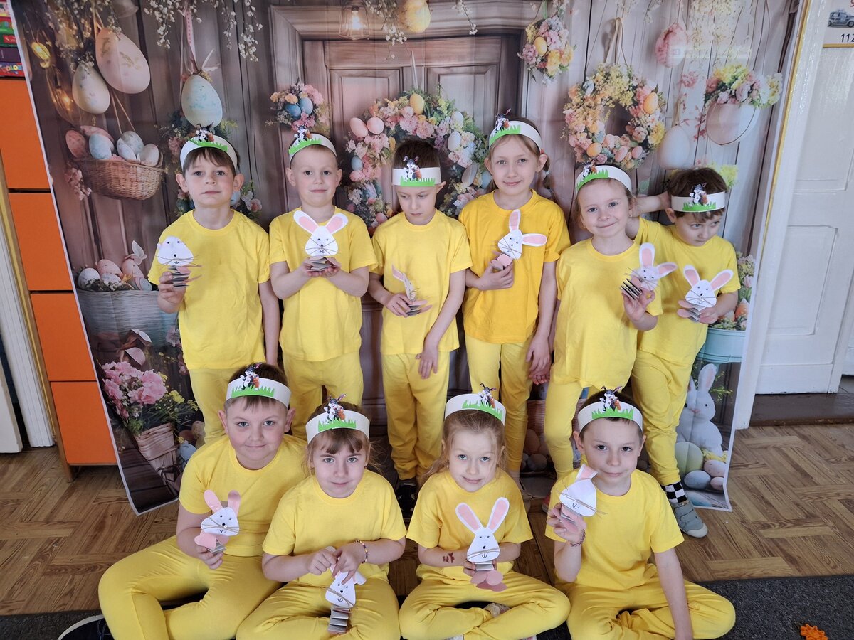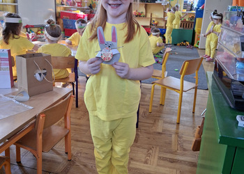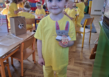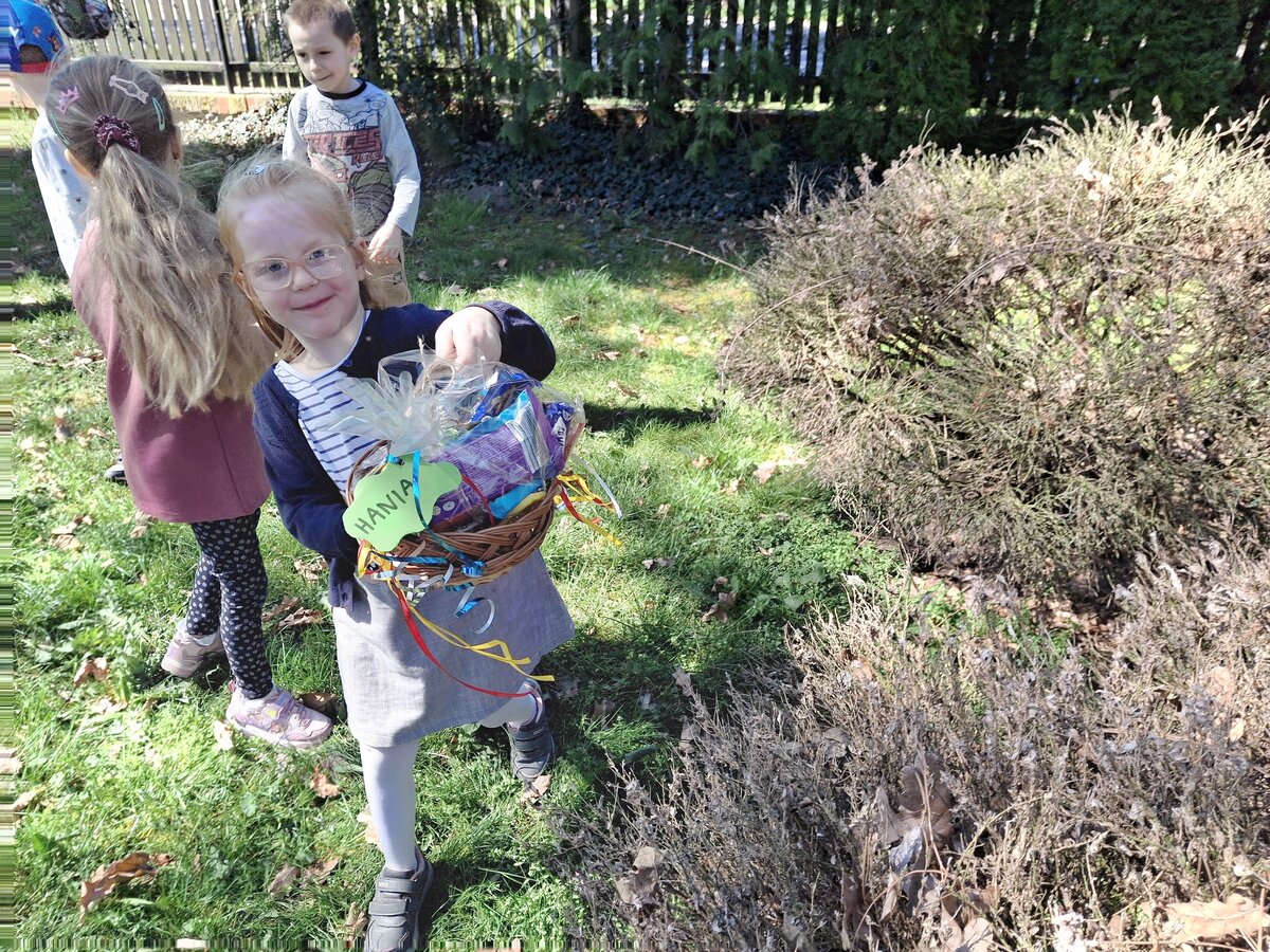 Jedną z najmilszych i najprzyjemniejszych dla dzieci tradycji wielkanocnych jest „ zajączek”. Chodzi on z koszykiem wielkanocnym i zostawia prezenty. Na jego przyjście trzeba się jednak przygotować. Słoneczka przebrały się w odpowiednie ubrania i zrobiły jajka, zajączki z różnych materiałów, które były ozdobą stołu do którego zasiadły częstując się Wielkanocną Babą i słodkościami. Rano wystawiliśmy koszyczki, tak przygotowane gniazdka można było zobaczyć na placu przedszkolnym, pięknie udekorowane i kolorowe. Zajączek żadnego z nich nie pominął. Przedszkolaki długo i niecierpliwie, czekały tego dnia na przyjście „ zajączka”. Toteż wielkie było zdziwienie naszych najmłodszych, gdy wychodząc na plac przedszkolny, odkryli przygotowane specjalnie dla nich niespodzianki. Jednak zdziwienie na twarzach szybko zastąpiły uśmiechy, bo któż z nas nie lubi dostawać prezentów. Na koniec złożyliśmy życzenia wszystkim Rodzicom i zaśpiewaliśmy piosenkę ,,Święta, Święta biją dzwony”. Życzymy Wszystkim Wesołych Świąt.
