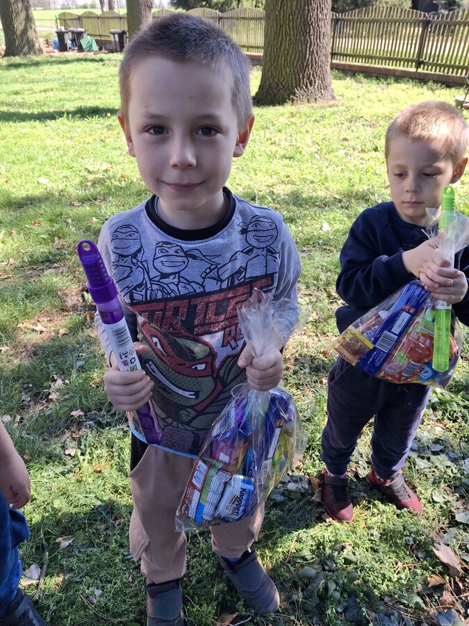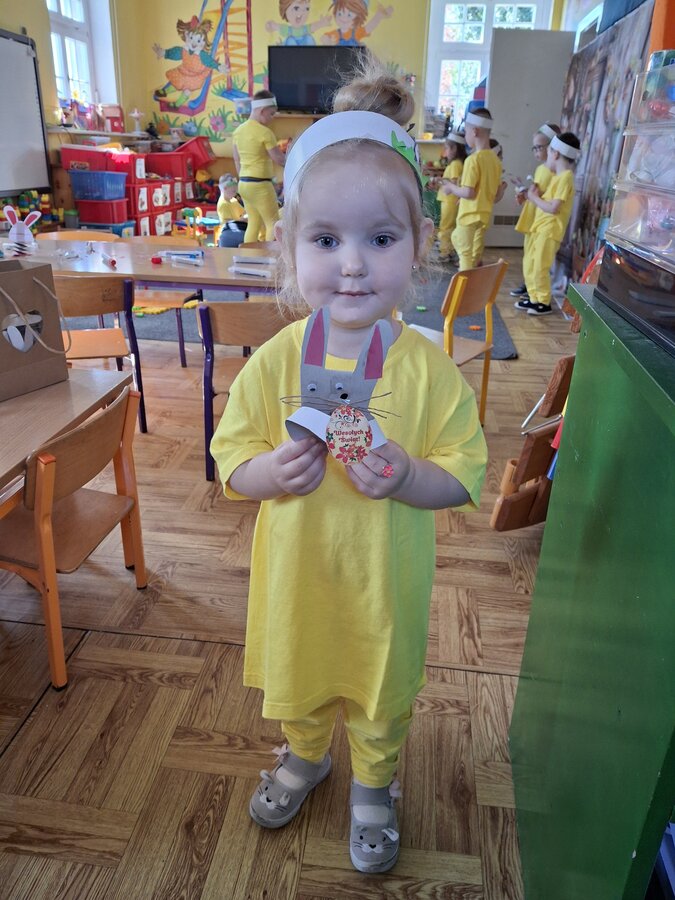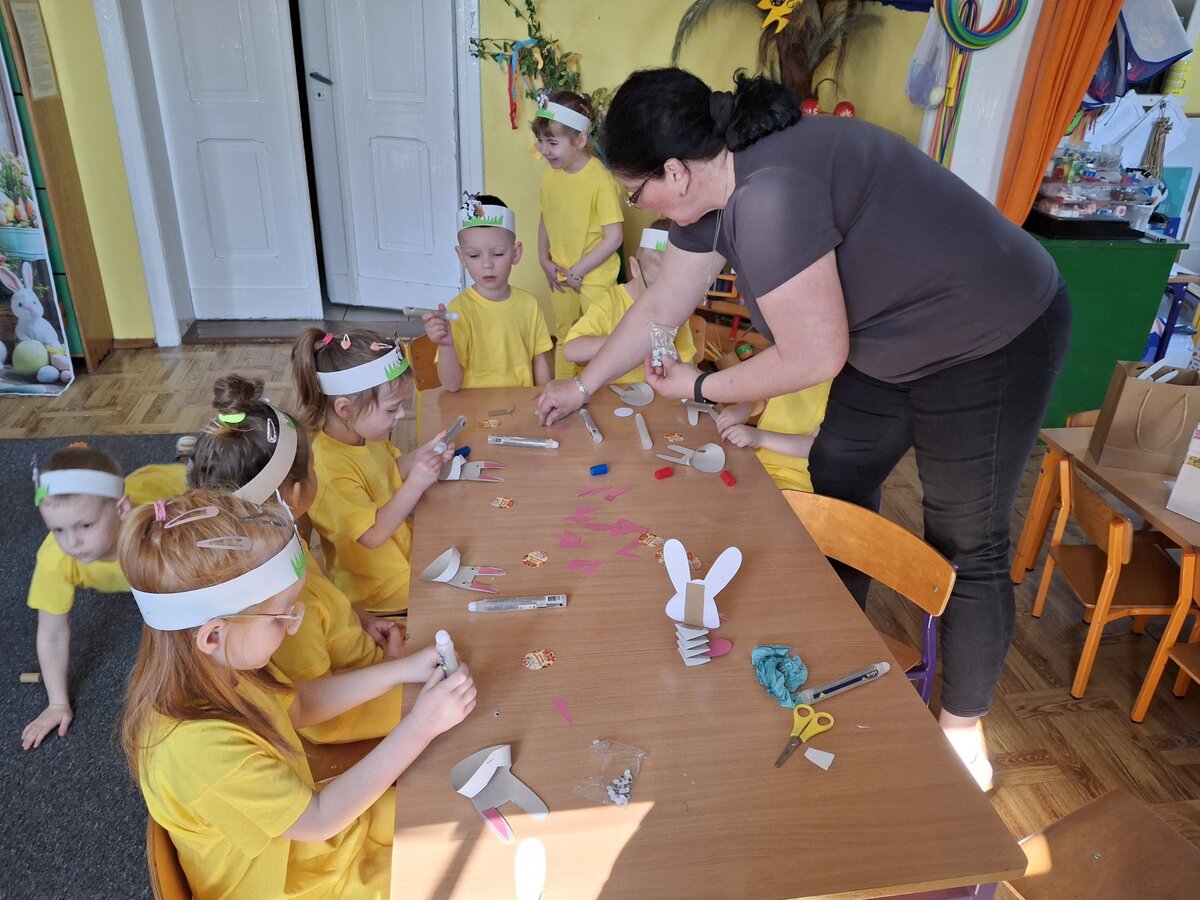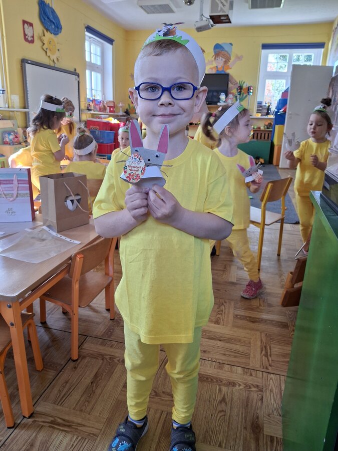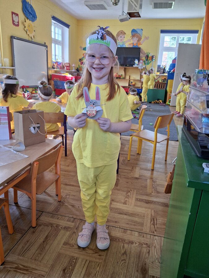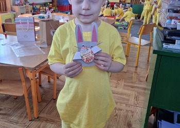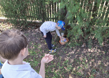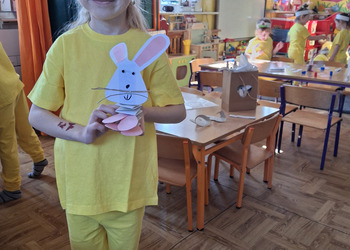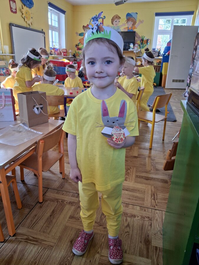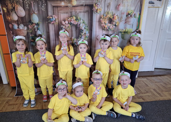 Jedną z najmilszych i najprzyjemniejszych dla dzieci tradycji wielkanocnych jest „ zajączek”. Chodzi on z koszykiem wielkanocnym i zostawia prezenty. Na jego przyjście trzeba się jednak przygotować. Słoneczka przebrały się w odpowiednie ubrania i zrobiły jajka, zajączki z różnych materiałów, które były ozdobą stołu do którego zasiadły częstując się Wielkanocną Babą i słodkościami. Rano wystawiliśmy koszyczki, tak przygotowane gniazdka można było zobaczyć na placu przedszkolnym, pięknie udekorowane i kolorowe. Zajączek żadnego z nich nie pominął. Przedszkolaki długo i niecierpliwie, czekały tego dnia na przyjście „ zajączka”. Toteż wielkie było zdziwienie naszych najmłodszych, gdy wychodząc na plac przedszkolny, odkryli przygotowane specjalnie dla nich niespodzianki. Jednak zdziwienie na twarzach szybko zastąpiły uśmiechy, bo któż z nas nie lubi dostawać prezentów. Na koniec złożyliśmy życzenia wszystkim Rodzicom i zaśpiewaliśmy piosenkę ,,Święta, Święta biją dzwony”. Życzymy Wszystkim Wesołych Świąt.