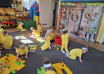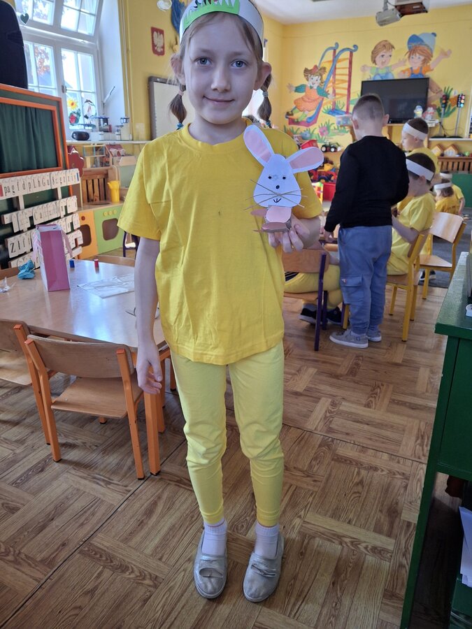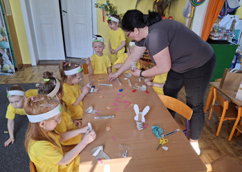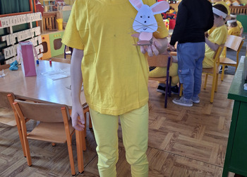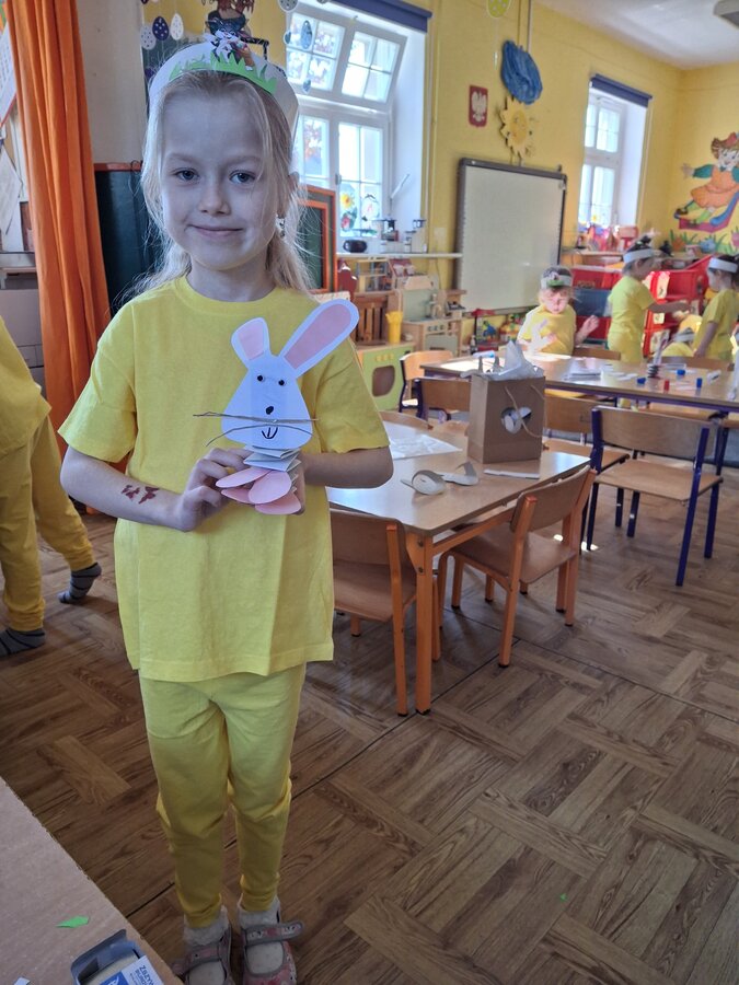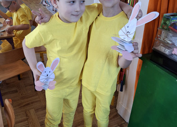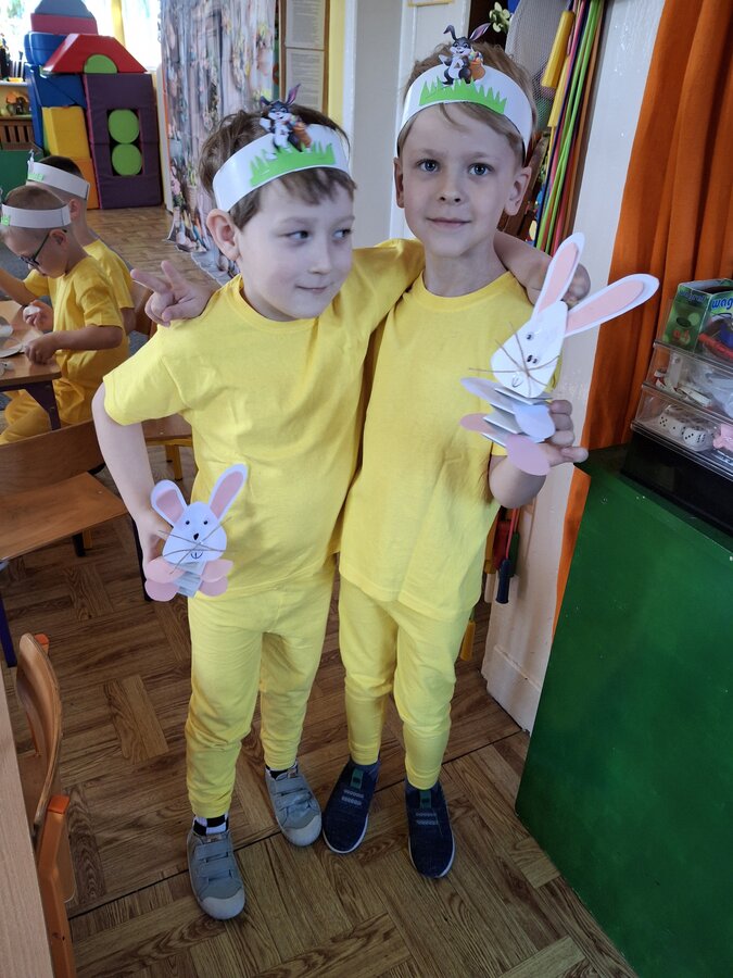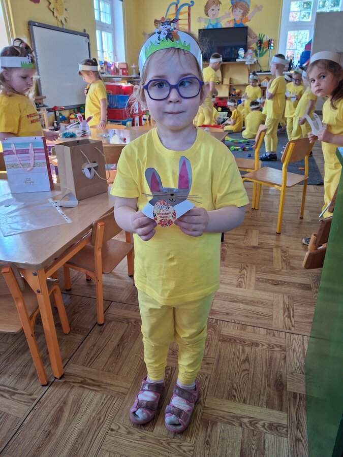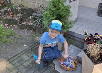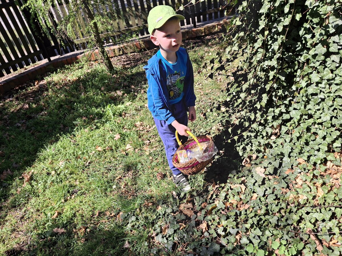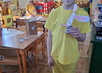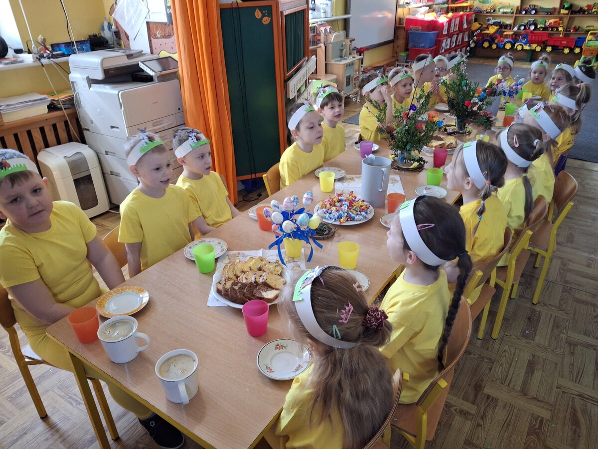 Jedną z najmilszych i najprzyjemniejszych dla dzieci tradycji wielkanocnych jest „ zajączek”. Chodzi on z koszykiem wielkanocnym i zostawia prezenty. Na jego przyjście trzeba się jednak przygotować. Słoneczka przebrały się w odpowiednie ubrania i zrobiły jajka, zajączki z różnych materiałów, które były ozdobą stołu do którego zasiadły częstując się Wielkanocną Babą i słodkościami. Rano wystawiliśmy koszyczki, tak przygotowane gniazdka można było zobaczyć na placu przedszkolnym, pięknie udekorowane i kolorowe. Zajączek żadnego z nich nie pominął. Przedszkolaki długo i niecierpliwie, czekały tego dnia na przyjście „ zajączka”. Toteż wielkie było zdziwienie naszych najmłodszych, gdy wychodząc na plac przedszkolny, odkryli przygotowane specjalnie dla nich niespodzianki. Jednak zdziwienie na twarzach szybko zastąpiły uśmiechy, bo któż z nas nie lubi dostawać prezentów. Na koniec złożyliśmy życzenia wszystkim Rodzicom i zaśpiewaliśmy piosenkę ,,Święta, Święta biją dzwony”. Życzymy Wszystkim Wesołych Świąt.