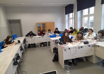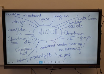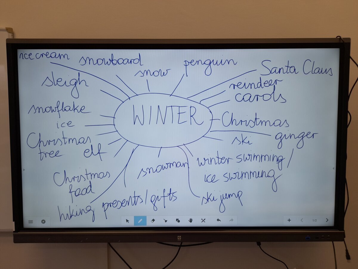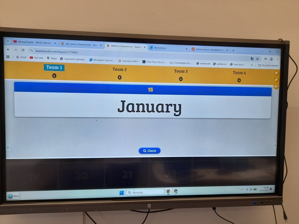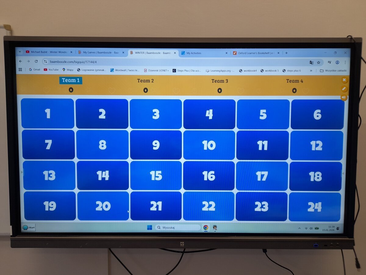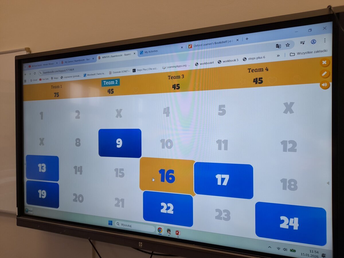 W ubiegły czwartek uczniowie klasy VII b uczestniczyli w kolejnych zajęciach języka angielskiego zorganizowanych w ramach innowacji pedagogicznej „Wykorzystanie autentycznych utworów muzycznych w nauczaniu języka angielskiego w oddziale dwujęzycznym.” Tym razem siódmoklasiści przypomnieli sobie i wzbogacili swoją znajomość słownictwa związanego z zimą. Inspiracją do tego tematu była zimowa piosenka pt. ”Winter Wonderland.” Słuchając utworu, uczniowie uzupełniali brakujące słowa w tekście, a następnie tłumaczyli go na język polski. Zajęcia zakończyła rywalizacja grupowa w grze przygotowanej na stronie baamboozle.com.