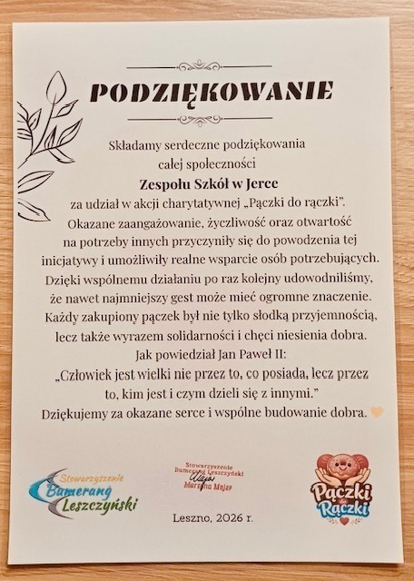 12 lutego w Zespole Szkół w Jerce oraz w przedszkolu przeprowadzono akcję charytatywną „Pączki do rączki”, realizowaną we współpracy ze Stowarzyszeniem Bumerang Leszczyński. Celem przedsięwzięcia było wsparcie działań stowarzyszenia na rzecz chorych oraz promowanie postaw prospołecznych wśród uczniów i przedszkolaków.