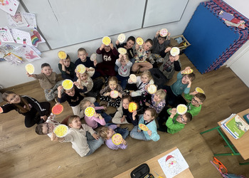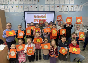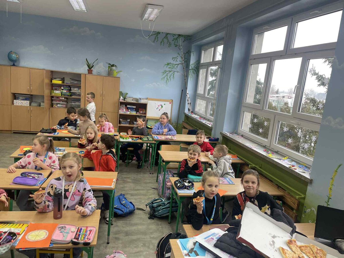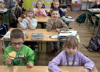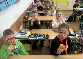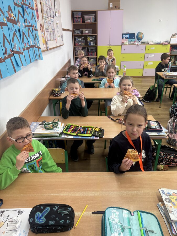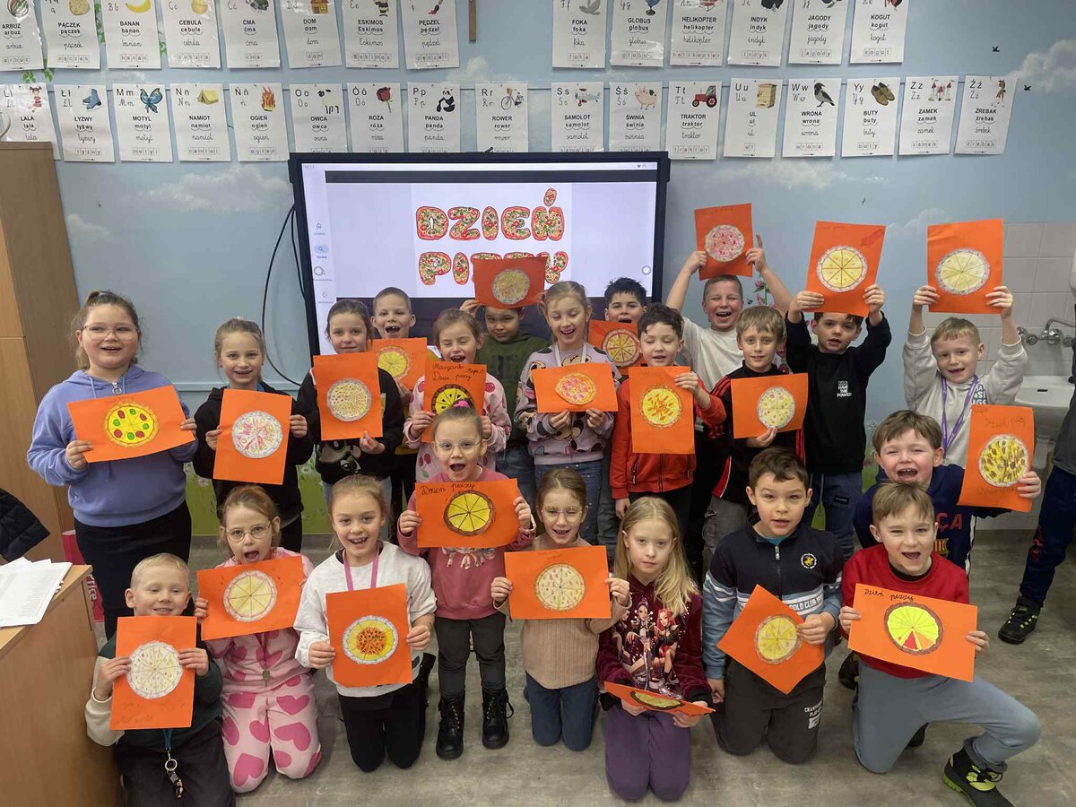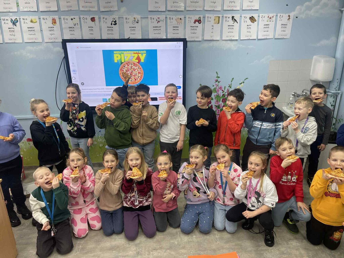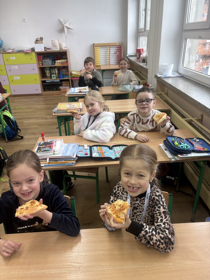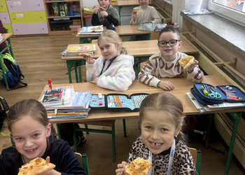 Dnia 9 lutego w klasach pierwszych obchodzony był „Międzynarodowy Dzień Pizzy”. Tego dnia nasze sale lekcyjne zamieniły się w prawdziwe, włoskie pizzerie. Najpierw rozmawialiśmy o tym, skąd pochodzi pizza i jakie ma składniki. Potem do klasy przyniesiono pyszną pizzę upieczoną przez jedną z mam. Każdy mógł spróbować swojego kawałka, wszyscy byli bardzo zadowoleni.