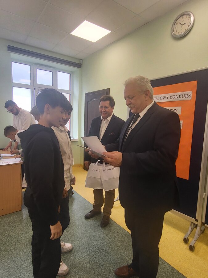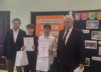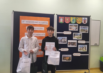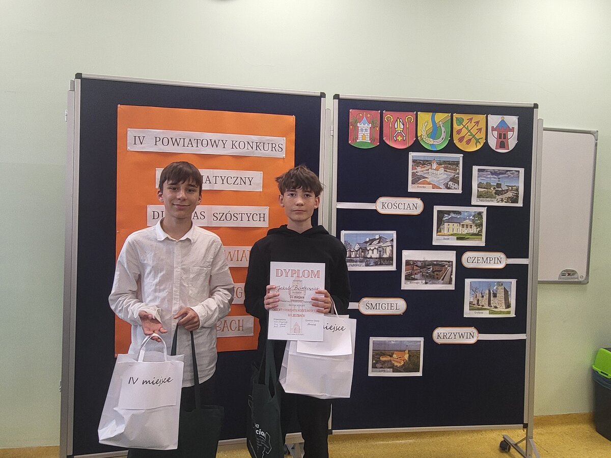 16 maja 2025 r. w Zespole Szkół Gminy Kościan w Starym Luboszu odbył się Powiatowy Konkurs Matematyczny dla klas VI „Obiekty Powiatu Kościańskiego w liczbach”. Do rywalizacji zespołowej przystąpiło 26 uczniów z 13 szkół. Naszą szkołę reprezentowali uczniowie z klasy 6b: Jakub Bartkowiak i Marcin Matyjaszczyk.