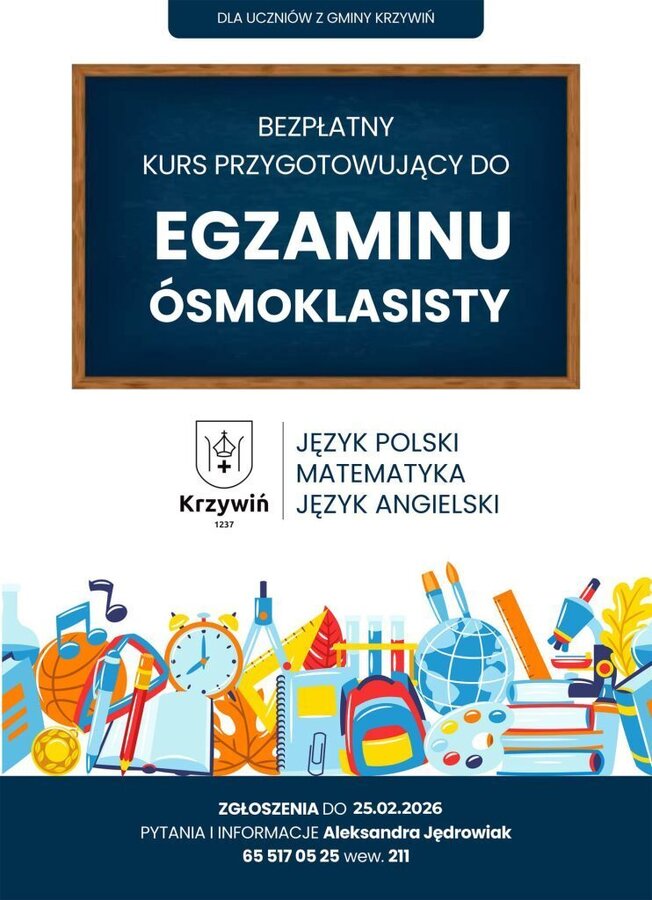 Burmistrz Miasta i Gminy Krzywiń proponuje młodzieży szkół podstawowych z terenu Gminy Krzywiń dodatkowe, nieodpłatne zajęcia z języka polskiego, matematyki i języka angielskiego.