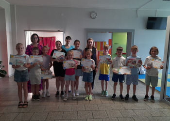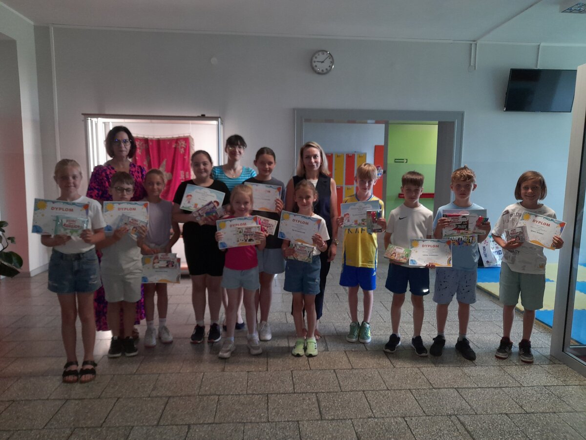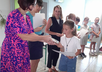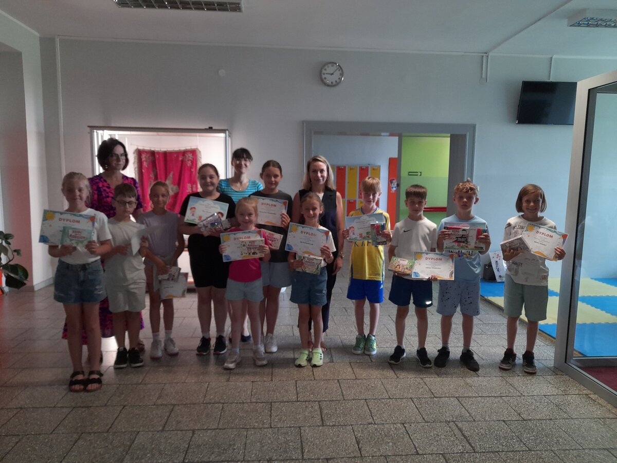 W środę 18. czerwca odbyło się ogłoszenie wyników konkursu „Mistrz języka angielskiego” dla uczniów klas II oraz III. W językowej rywalizacji wzięli udział wszyscy uczniowie. Konkurs miał formę testu i obejmował materiał, który dzieci poznawały w mijającym roku szkolnym. Sprawdzana była umiejętność rozumienia ze słuchu, czytania, znajomość słownictwa i poprawnej pisowni, a także układania poprawnych zdań z rozsypanych wyrazów. Laureaci otrzymali pamiątkowe dyplomy oraz drobne upominki.