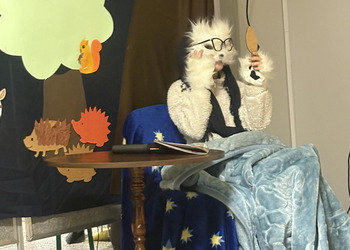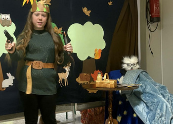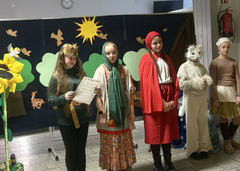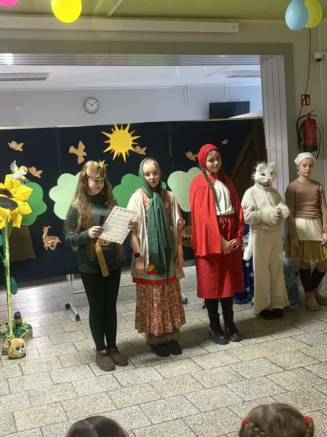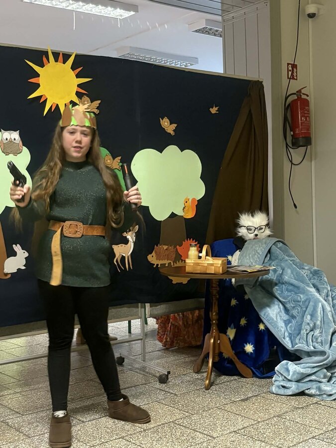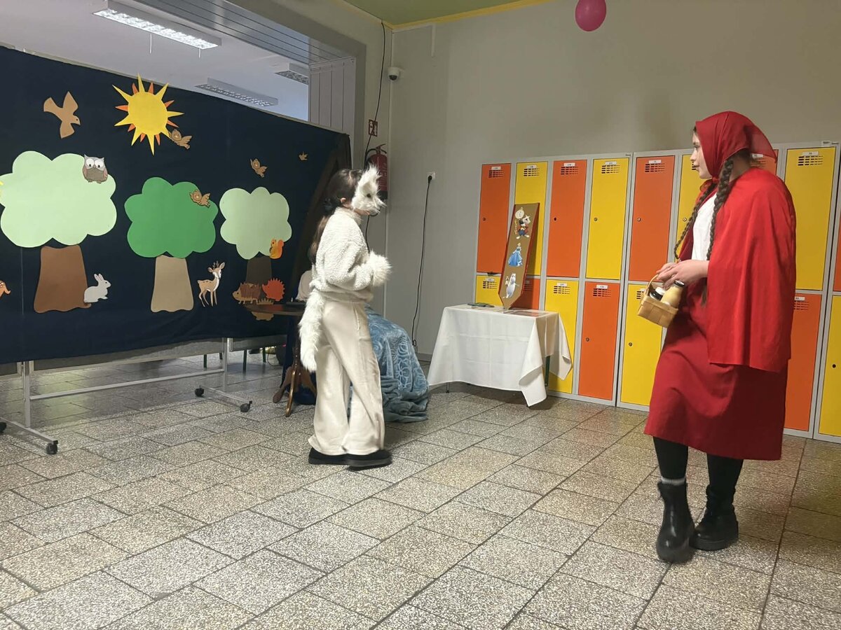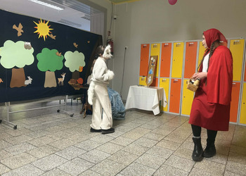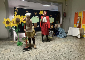 Spotkanie rozpoczęło się od inscenizacji bajki „Czerwony Kapturek” w wykonaniu uczennic z klasy 4 b. Młode aktorki zaprezentowały swoją interpretację klasycznej opowieści o odwadze, sprycie i dobroci, która bardzo spodobała się pierwszoklasistom.