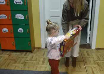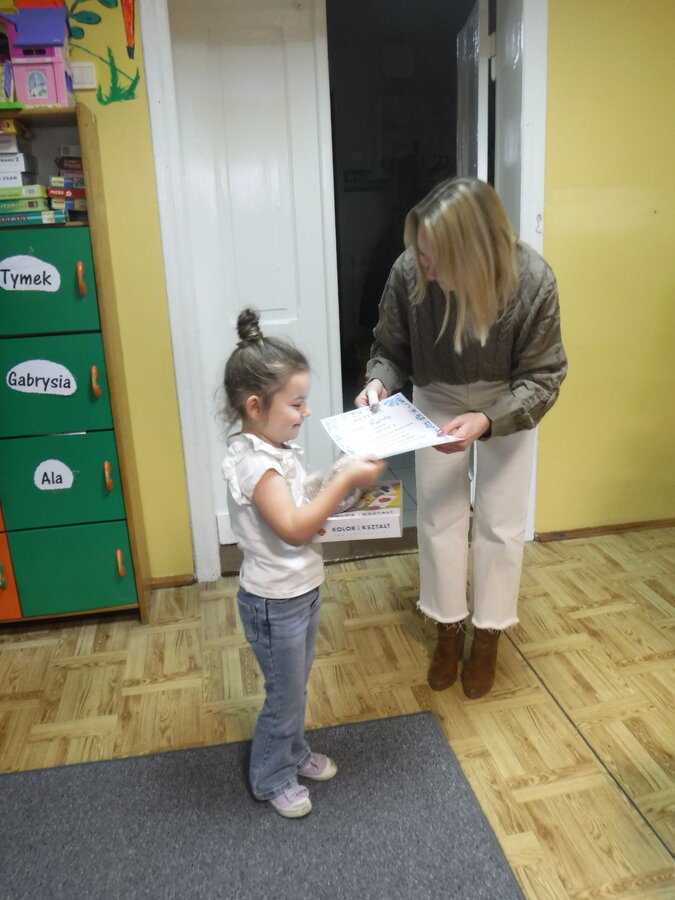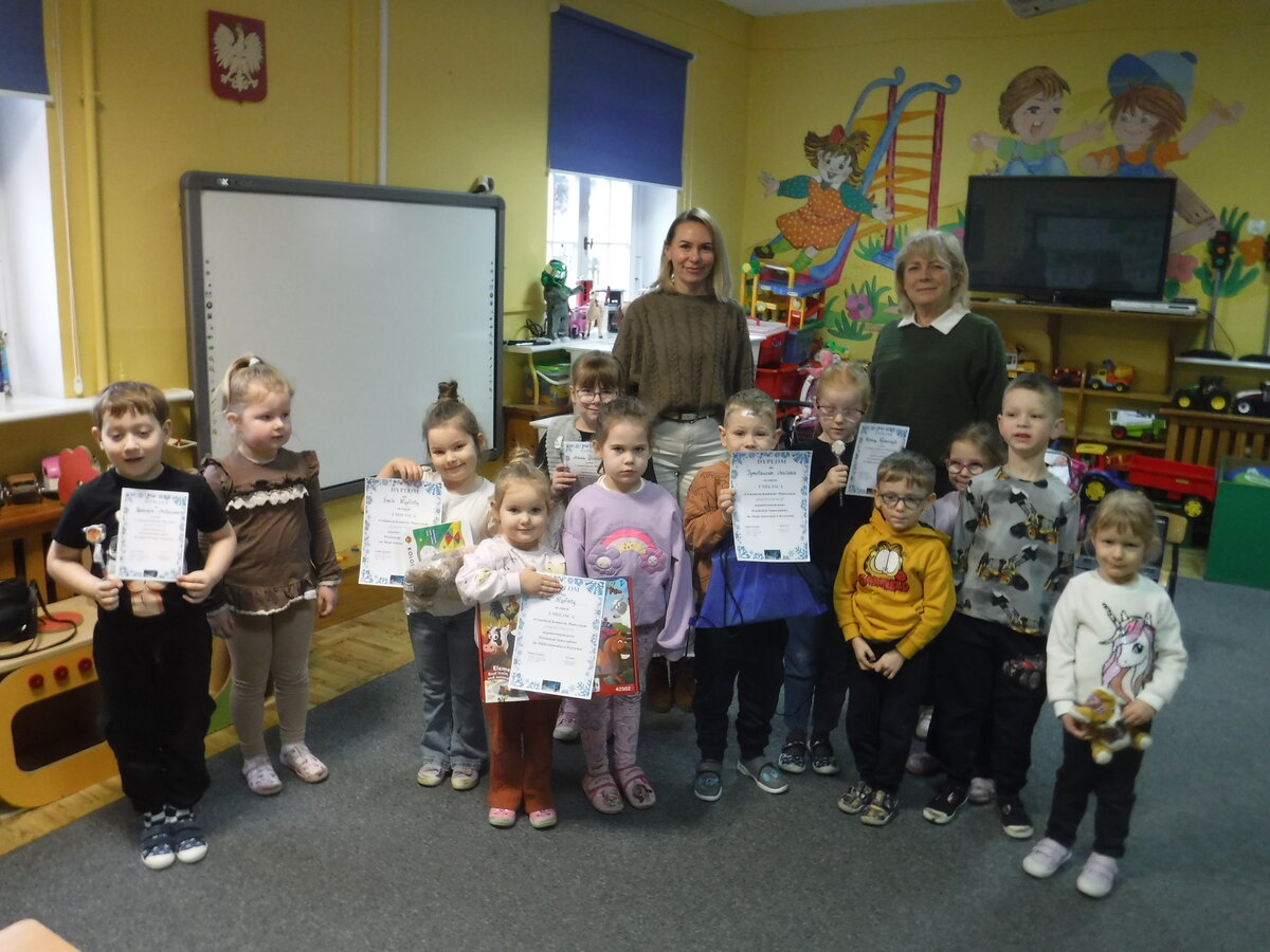 Z tej okazji zaprosiliśmy do przedszkola Dyrektora Zespołu Szkół w Jerce panią Izabelę Kostrzewę, która wszystkim dzieciom wręczyła nagrody, dyplomy oraz pogratulowała dzieciom sukcesu.