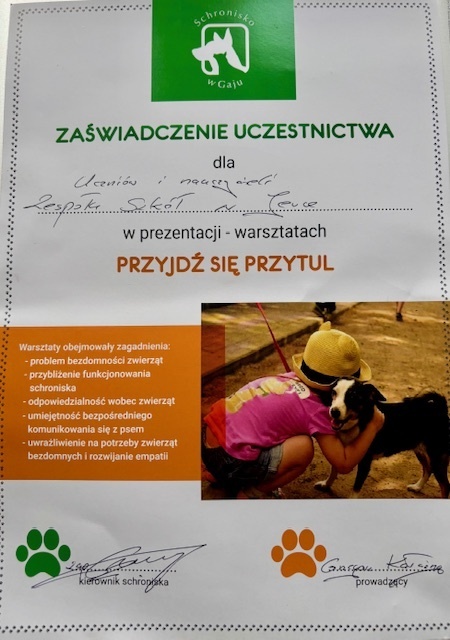 W dniu 4 czerwca członkowie Szkolnego Klubu Wolontariusza odwiedzili Schronisko dla Bezdomnych Zwierząt w Gaju przekazując karmę oraz inne potrzebne artykuły, które udało się zgromadzić podczas zbiórki.