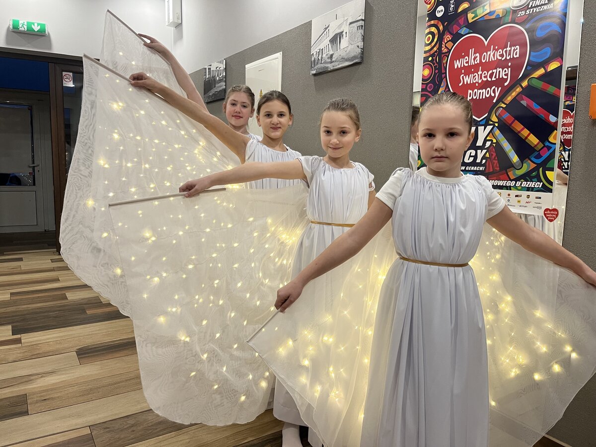 W pierwszej części występu uczennice przedstawiły nastrojowy taniec aniołów, pełen delikatnych ruchów i symboliki. Układ, wykonany do poruszającego utworu „The Spirit of Christmas Past”, niósł przesłanie dobra, nadziei oraz wrażliwości na potrzeby innych, tworząc wyjątkową, refleksyjną atmosferę i podkreślając ideę pomagania, od lat towarzyszącą Wielkiej Orkiestrze Świątecznej Pomocy.
