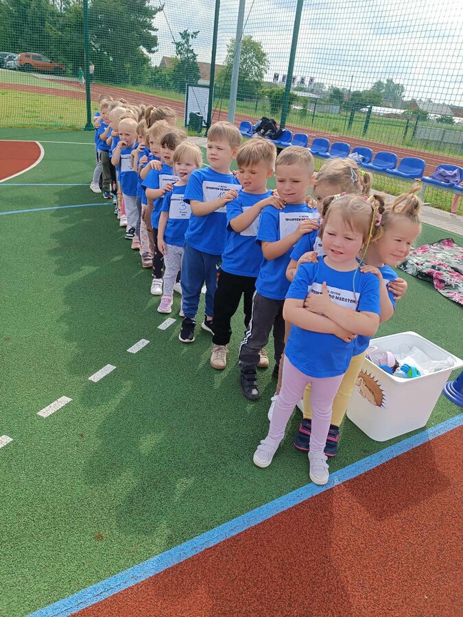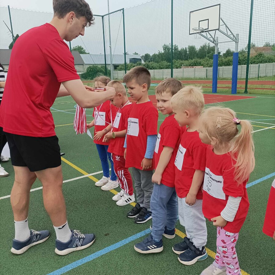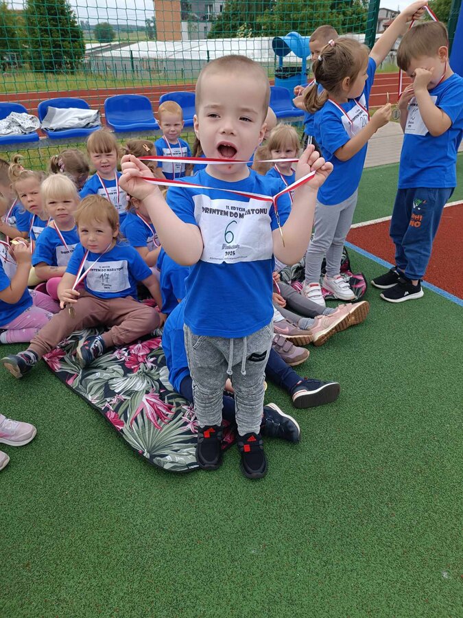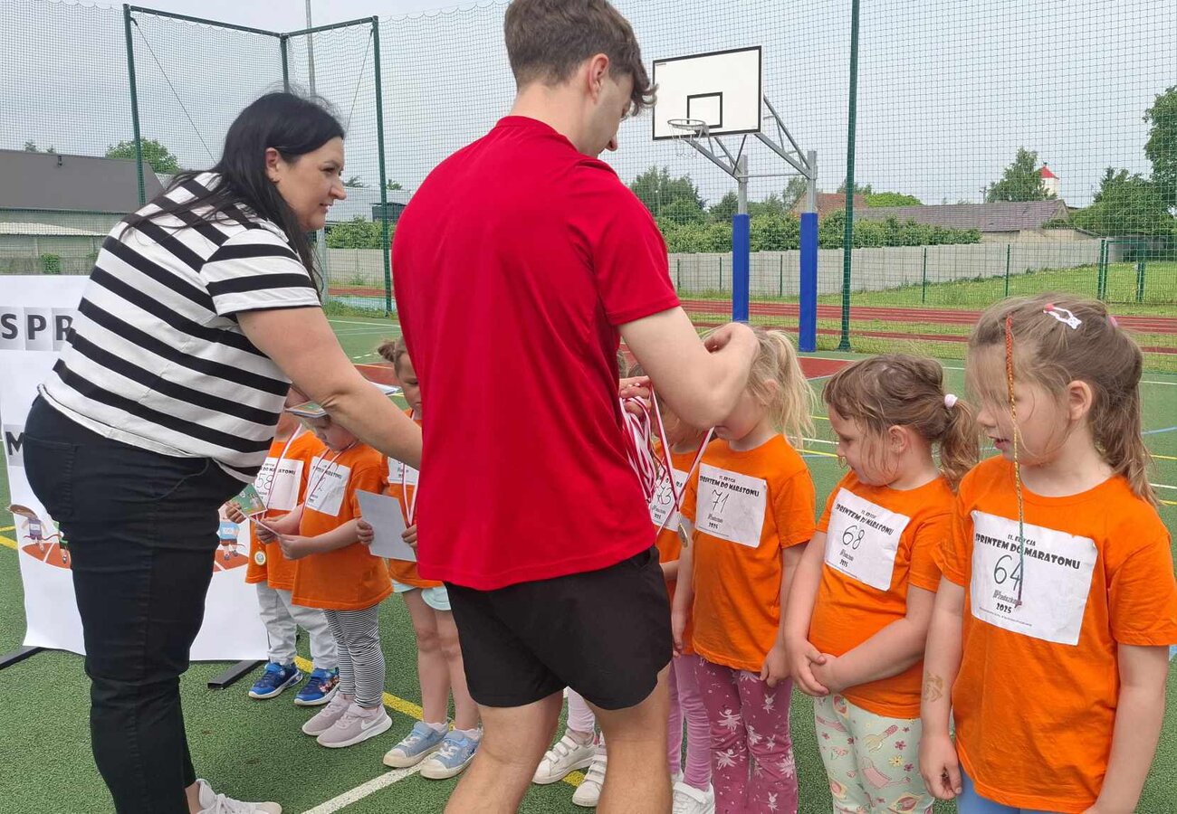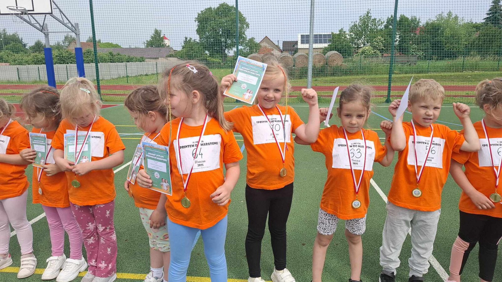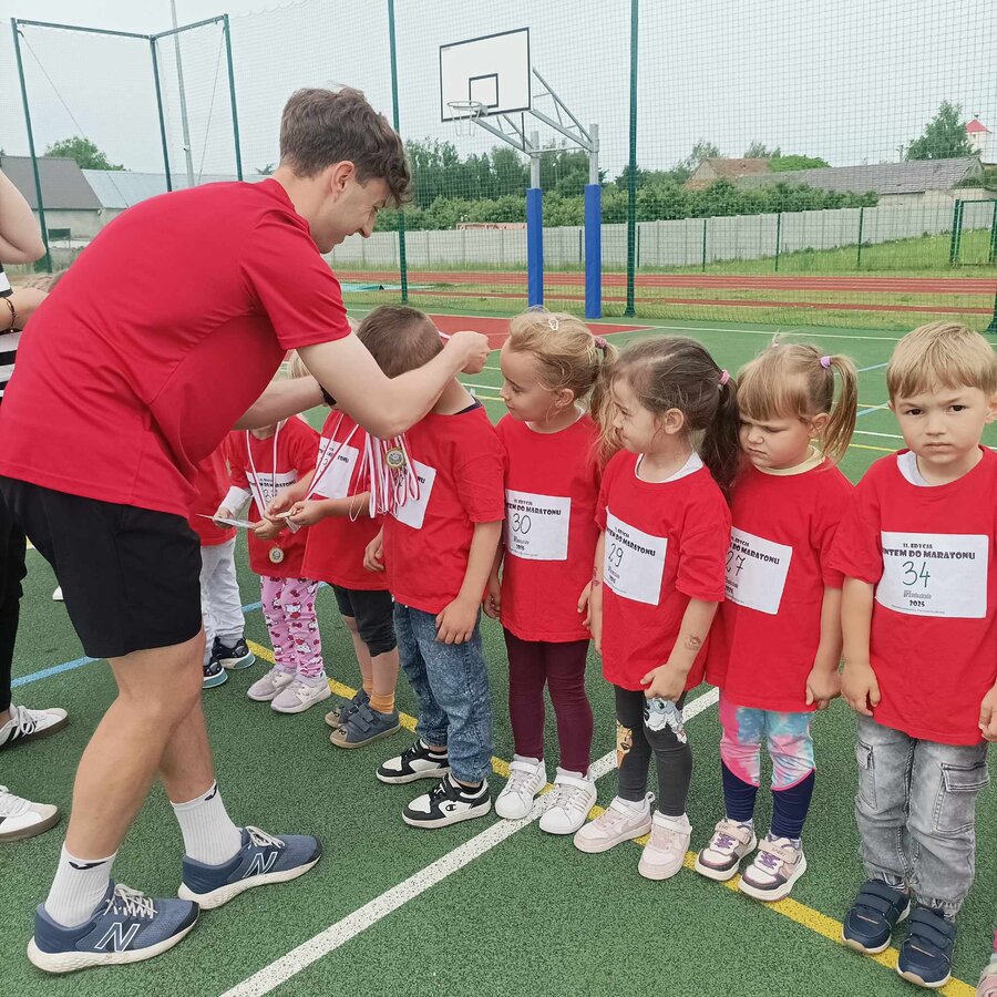 2 czerwca dzieci z Przedszkola Samorządowego w Jerce wzięły udział w XI Ogólnopolskim Maratonie Przedszkolaków pod hasłem „Sprintem do maratonu”. Celem tego wydarzenia jest promowanie zdrowego stylu życia i aktywnego spędzania czasu, popularyzowanie biegów wśród dzieci oraz kształtowanie u przedszkolaków nawyku podejmowania aktywności fizycznej. Akcja ta zachęca dzieci do zabawy i ruchu na świeżym powietrzu, a także kładzie nacisk na edukację zdrowotną już od najmłodszych lat. Od samego rana w przedszkolu gościliśmy trenera klubu Promień Krzywiń Pana Adriana Gościniaka, który rozmawiał z dziećmi o sporcie i zdrowym odżywianiu. Zachęcał wszystkich do aktywności fizycznej. Następnie wszystkie dzieci otrzymały numery startowe i wspólnie udaliśmy się na szkolne boisko, gdzie pan Adrian przeprowadził dla wszystkich rozgrzewkę. Kolejnym punktem programu był bieg wyznaczoną trasą. Wszystkie przedszkolaki bez trudu przebiegły wyznaczony dystans. Na zakończenie każde dziecko otrzymało medal i dyplom. Warto podkreślić, że wszyscy byli zwycięzcami, nie liczyło się zdobyte miejsce, lecz pokonanie wyznaczonego dystansu w miłej atmosferze.