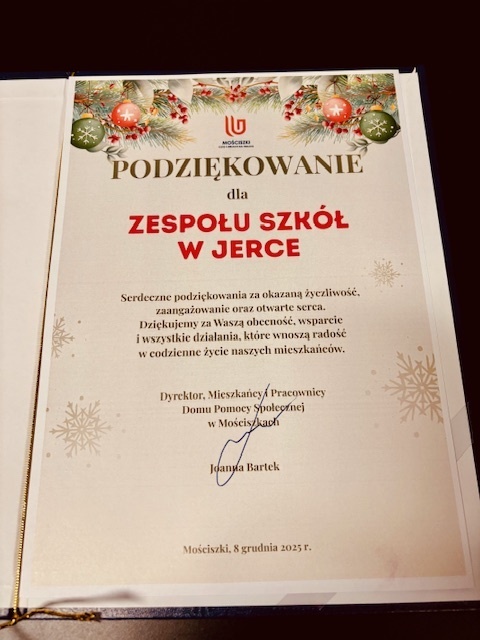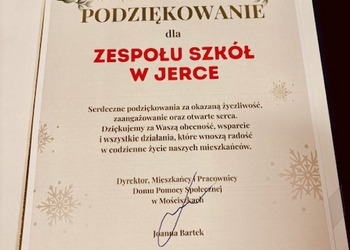 Wolontariusze ze Szkolnego Klubu Wolontariusza odwiedzili pensjonariuszy Domu Pomocy Społecznej w Mościszkach. Podczas wizyty przekazali dary zebrane w szkolnej akcji oraz wręczyli kartki świąteczne przygotowane przez najmłodszych wolontariuszy z przedszkola.